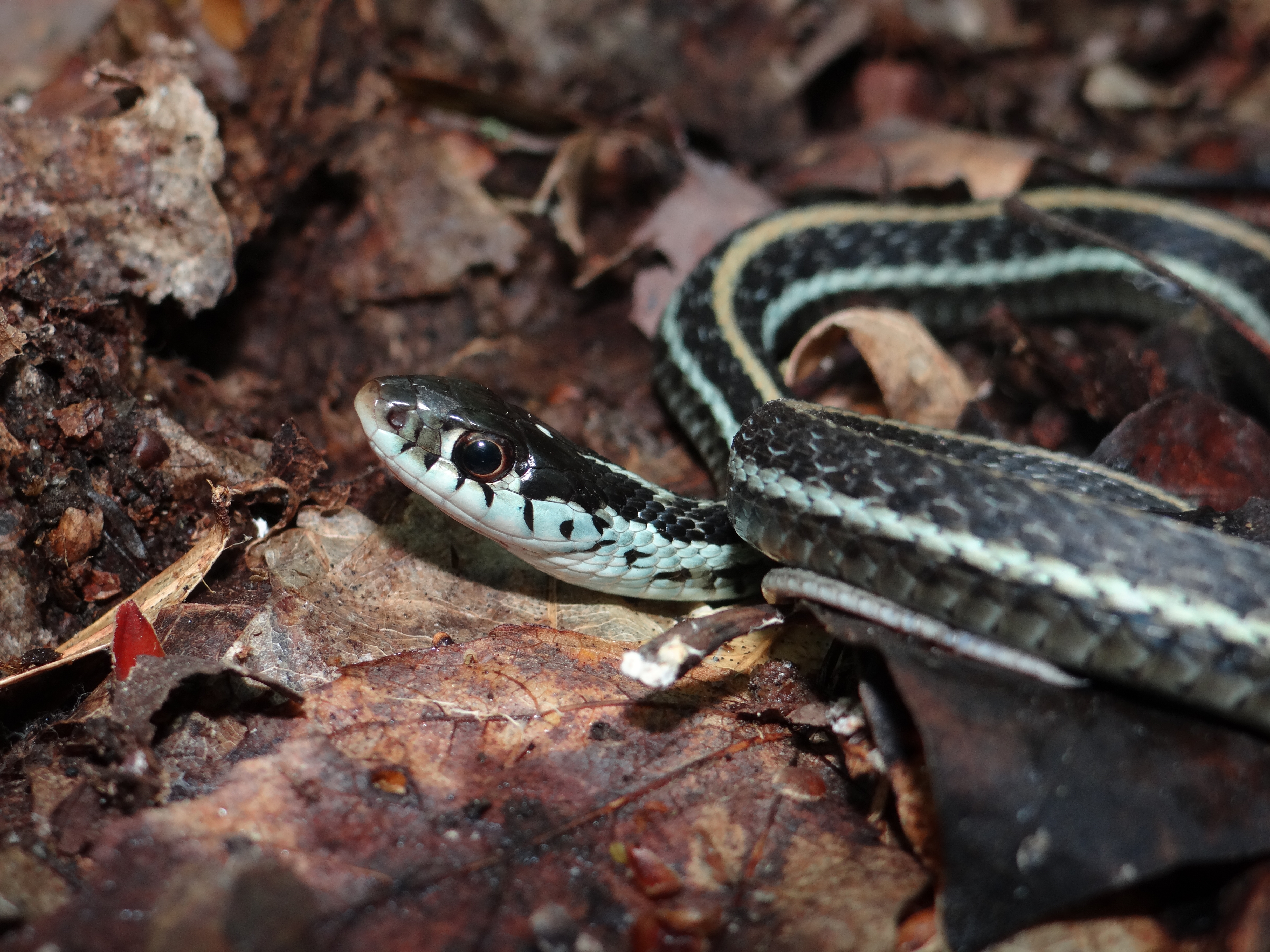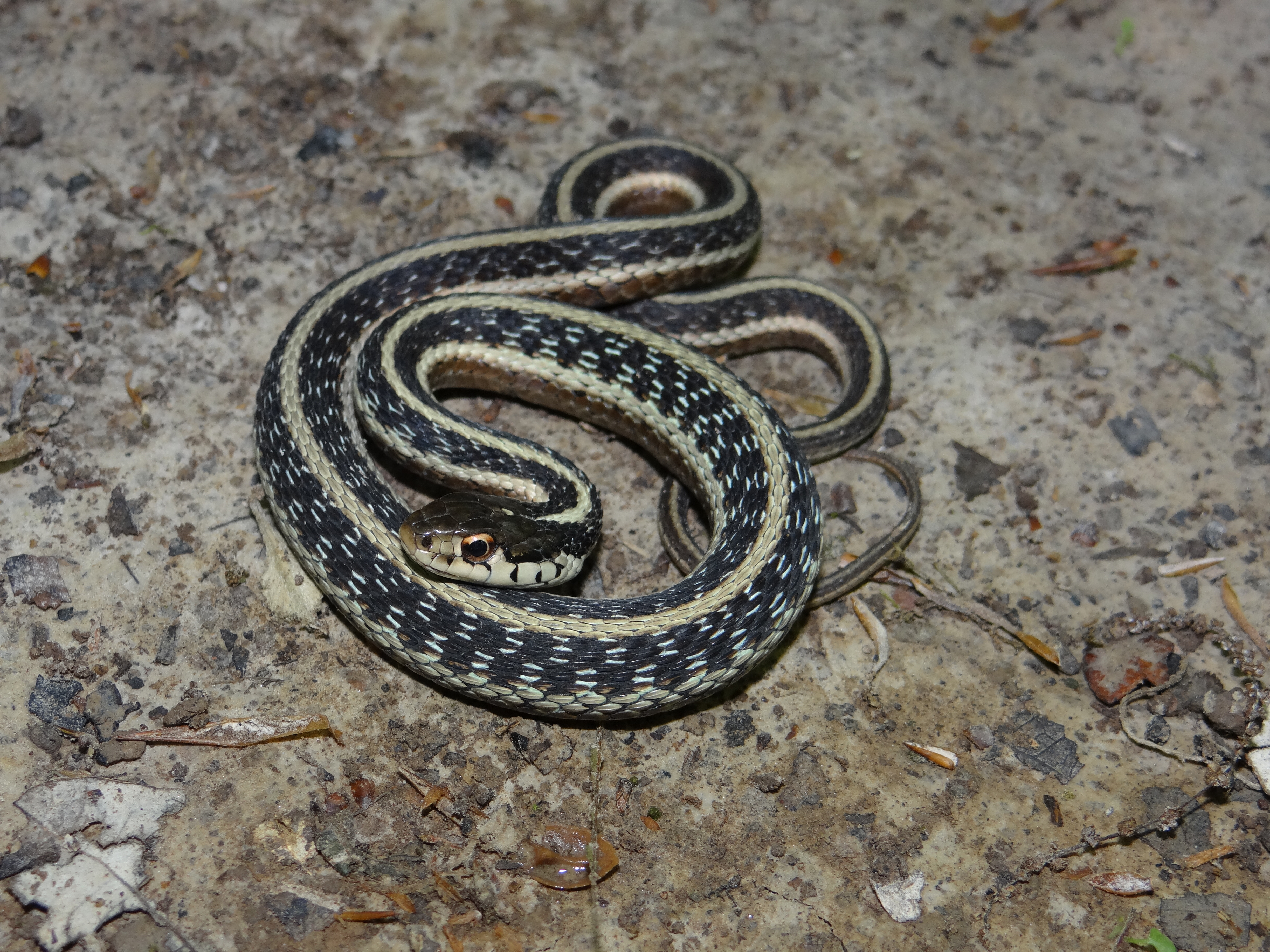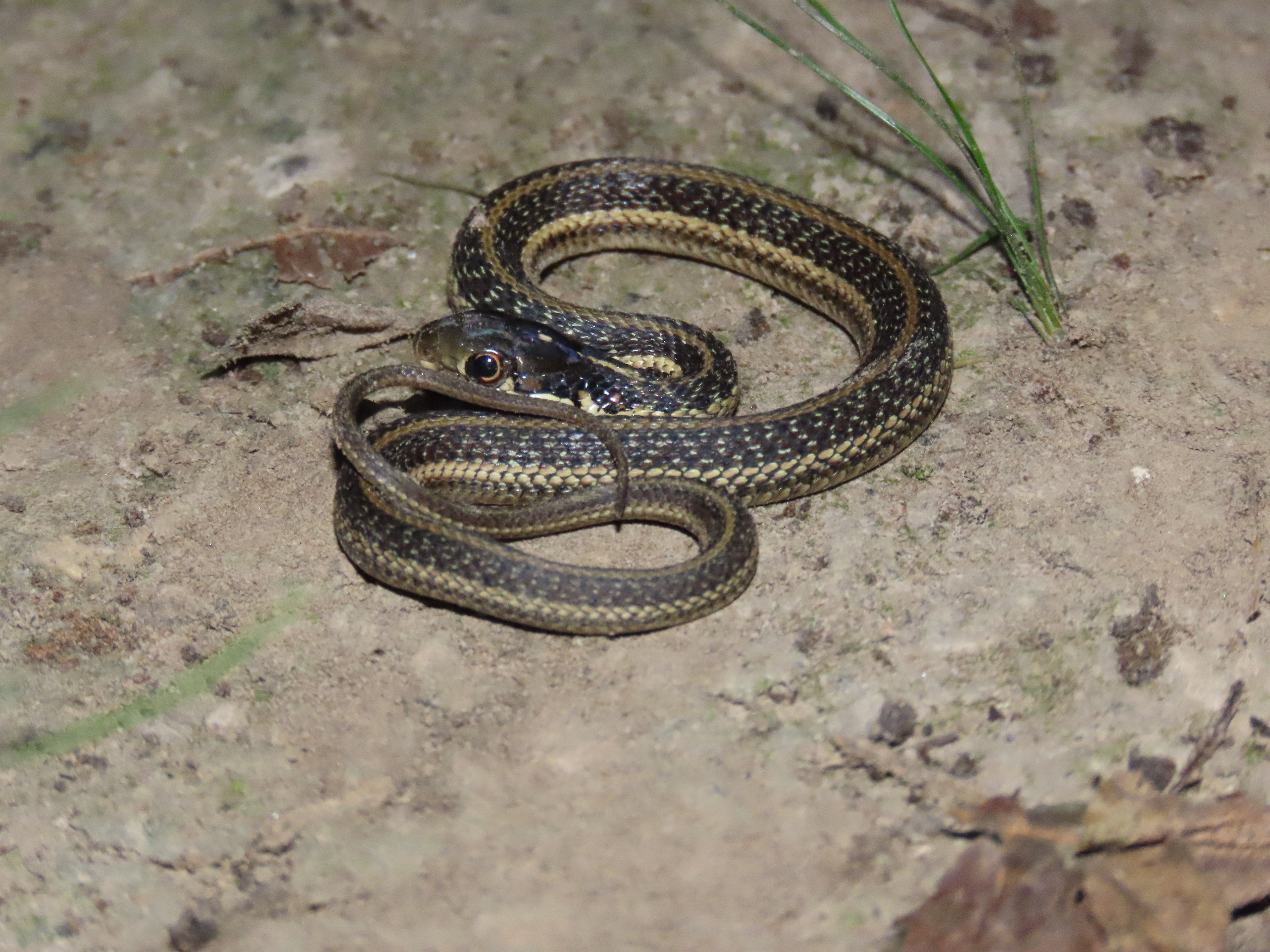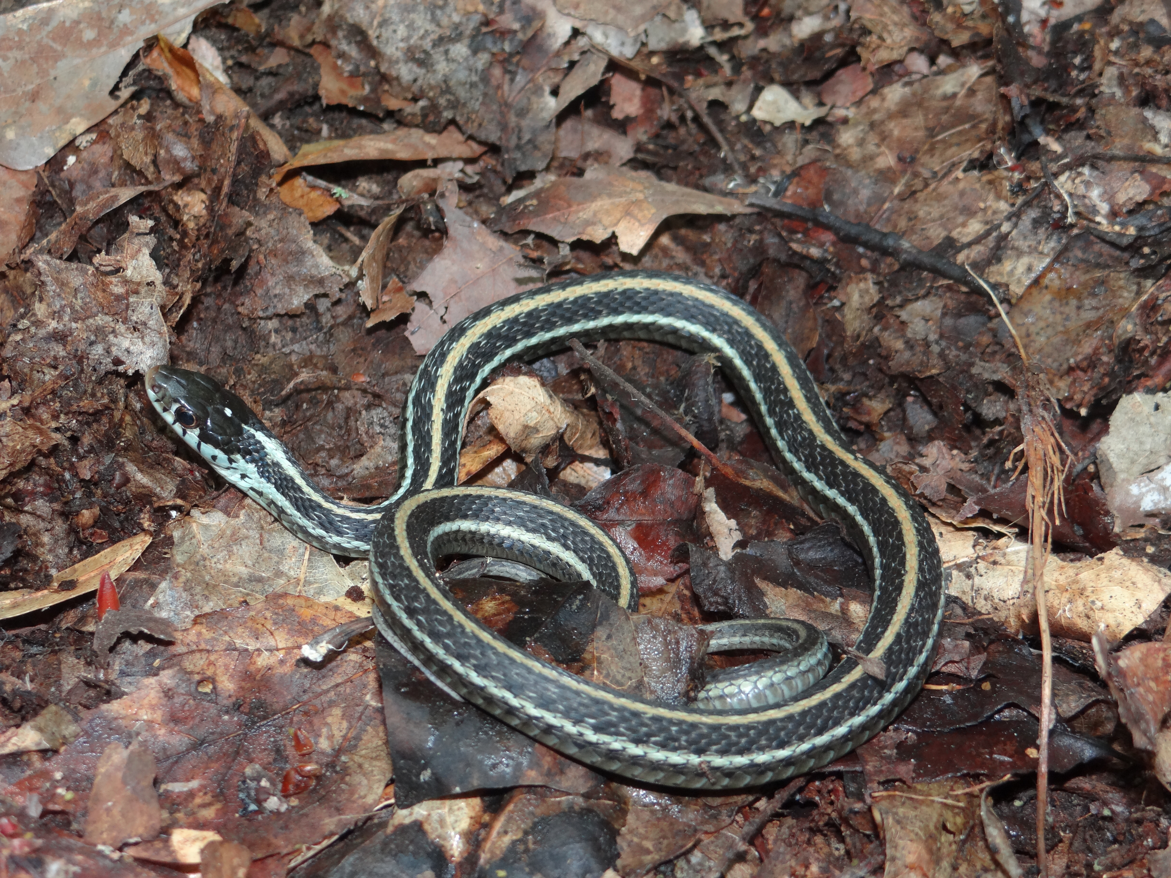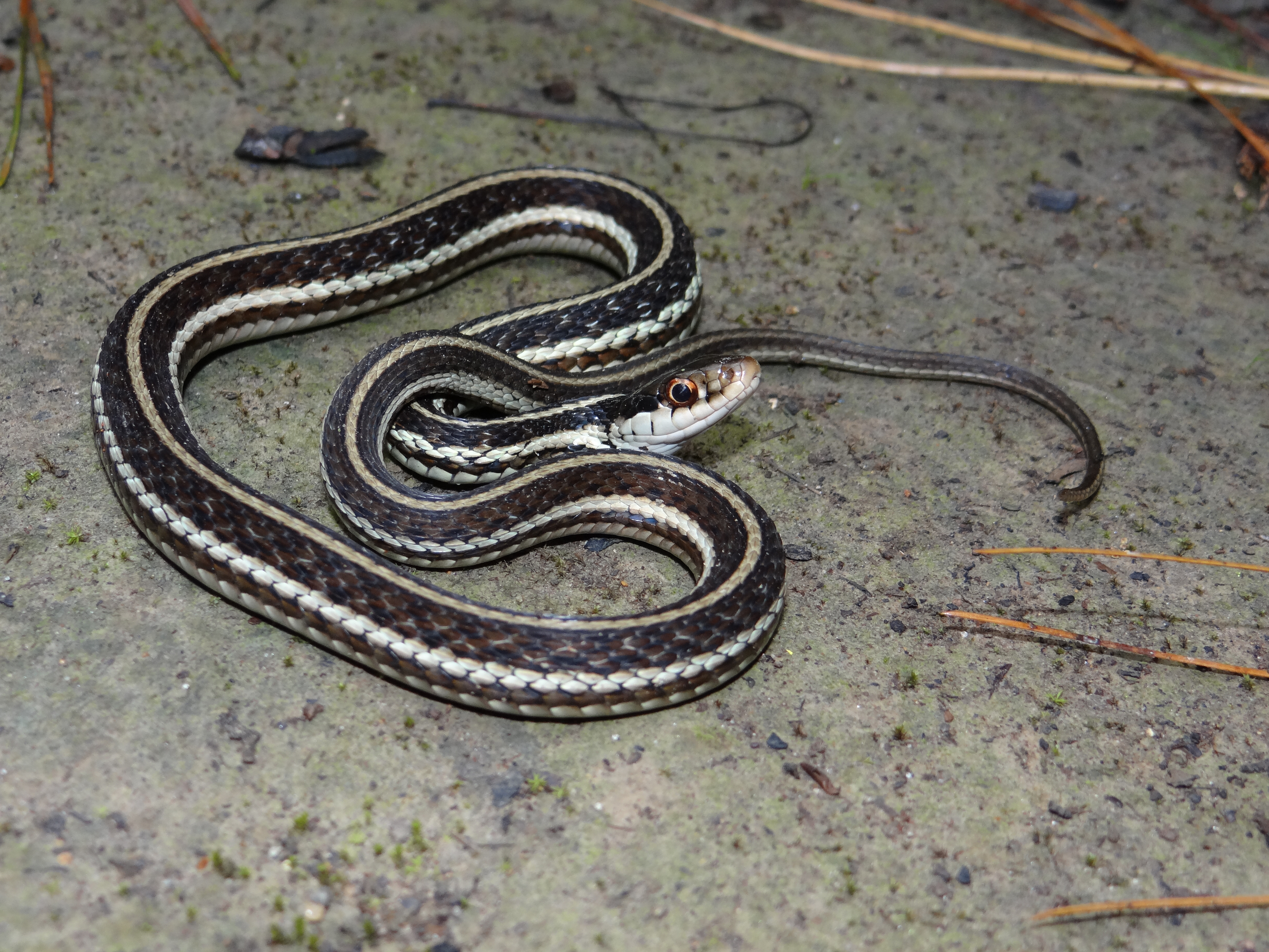 Similar Species: Common Gartersnakes have lateral stripes on the second and third scale row whereas the two species of Ribbonsnakes in Louisiana have lateral stripes on the third and fourth scale row. In addition Common Gartersnakes have a relatively shorter tail than Ribbonsnakes and typically posses black bars on the posterior labial (lip) scales whereas Ribbonsnakes have raltively longer tails and typically have unmarked labial scales. In addition the preocular creamy spot is typically more prominent in the Ribbonsnakes than the Common Gartersnake. In the small area of the eastern Florida Parishes where the Eastern Ribbonsnake overlaps the range of the Western Ribbonsnake, the two species can be told apart by examining the top of the head and the area where the dorsal scales meet the ventral scales. Typically Eastern Ribbonsnakes either lack parietal spots completely or they are much reduced compared to the bold marks typical of Western Ribbonsnakes. Also, Eastern Ribbonsnakes typically have a brownish tinge to the edges of the ventral scales where they meet the dorsal scares whereas the ventral scales are typically immaculate in Western Ribbonsnakes.