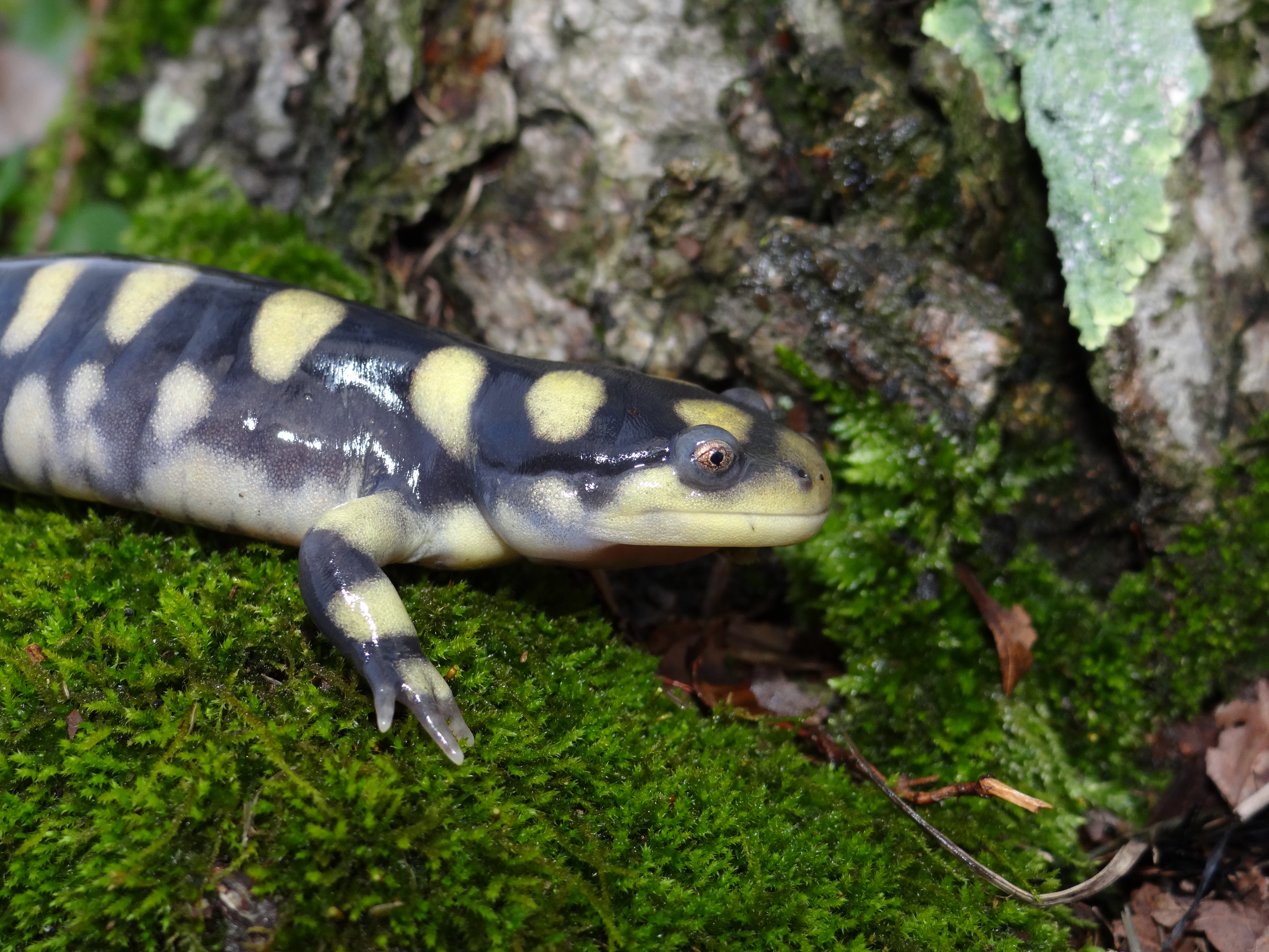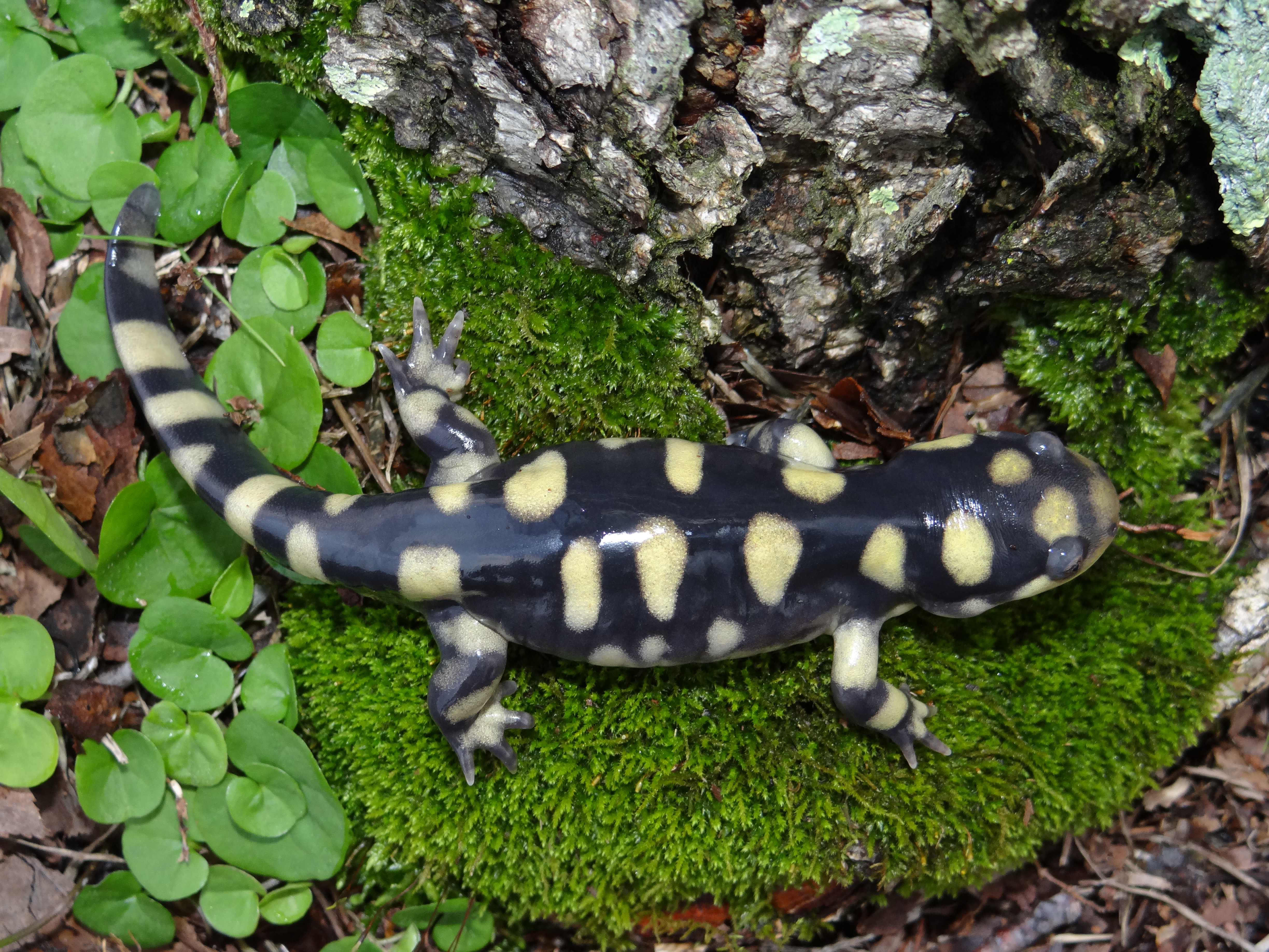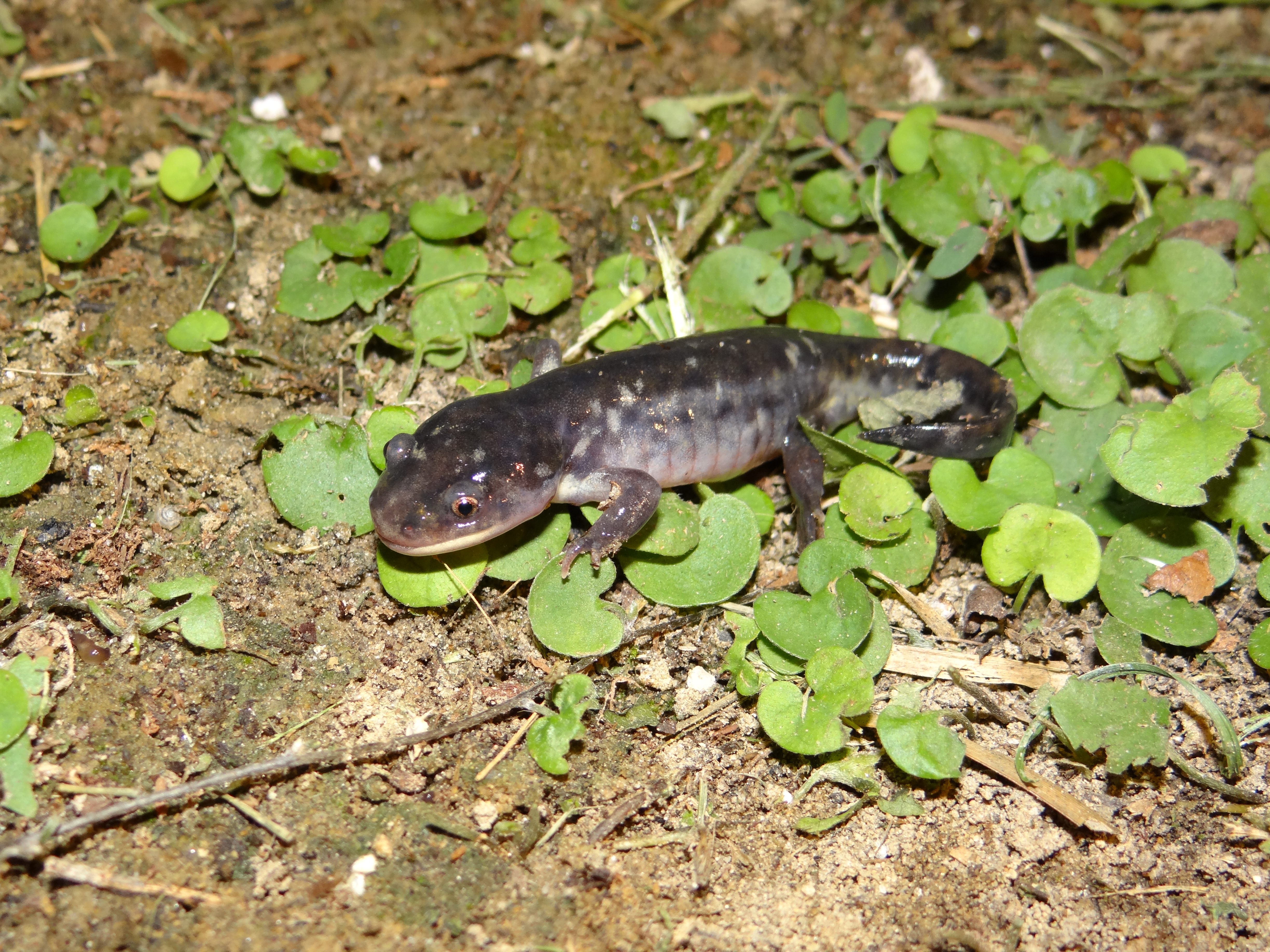 Adult Description: Large, robust salamander (maximum 13”) with broad head. Black, dark gray, or brown on top with yellow or tan irregularly shaped and variably sized rounded spots extending onto sides and laterally compressed tail. Usually 12 costal grooves but range from 11–14. Belly is paler than top with yellow or tan markings, particularly at edges.