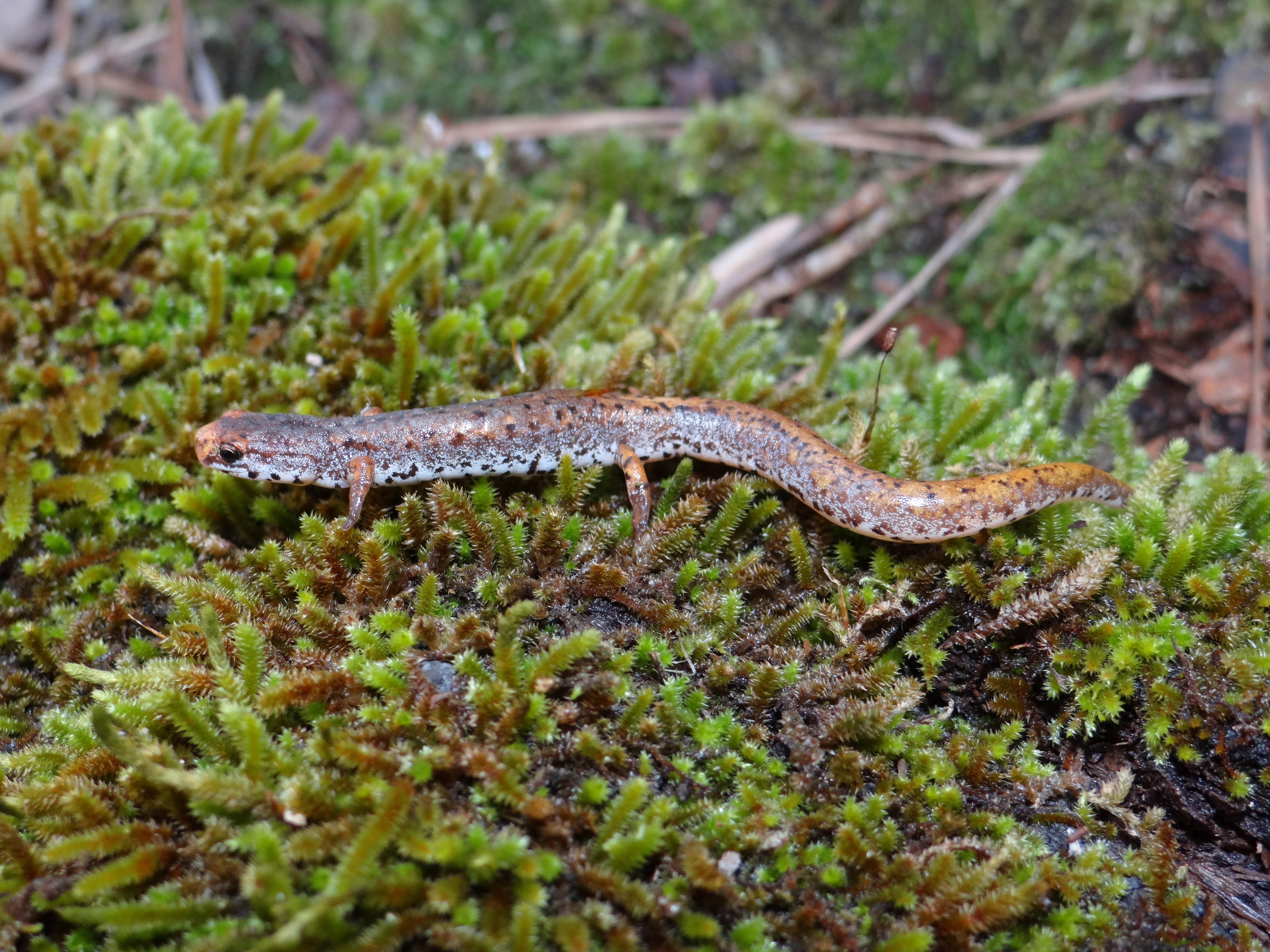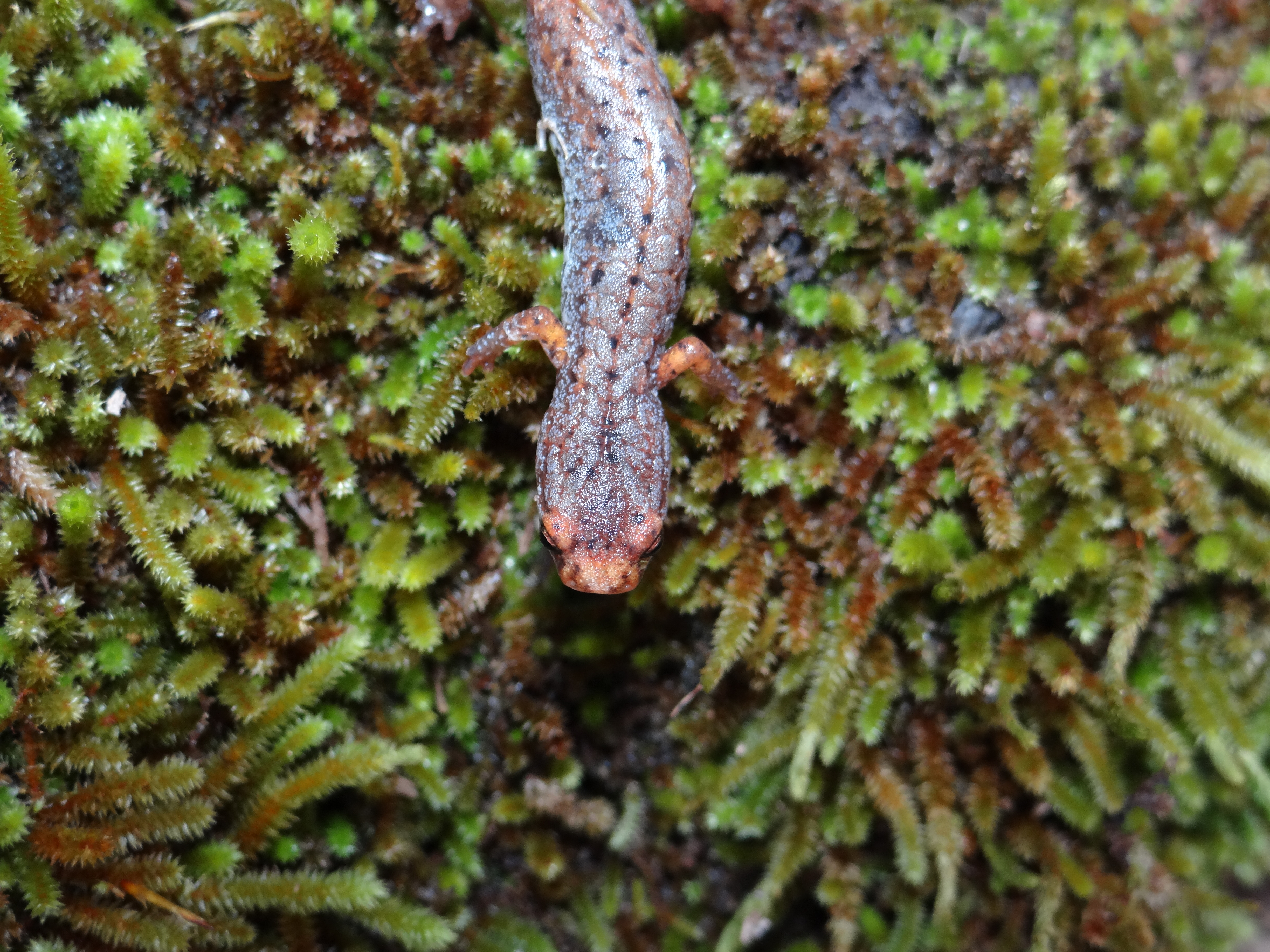 Adult Description: Small salamander (maximum 4”) with a reddish tan to rusty color on top, with small, scattered black spots and markings. Often more vibrant tan or orange coloration on snout, tops of limbs, and tail. Sides may be gray or white with gray markings like belly, particularly on lower sides. Short, squared-off snout. 13–14 costal grooves. Obvious constriction at base of tail. Four toes on hindlimbs. Belly is cream to white with black spots.