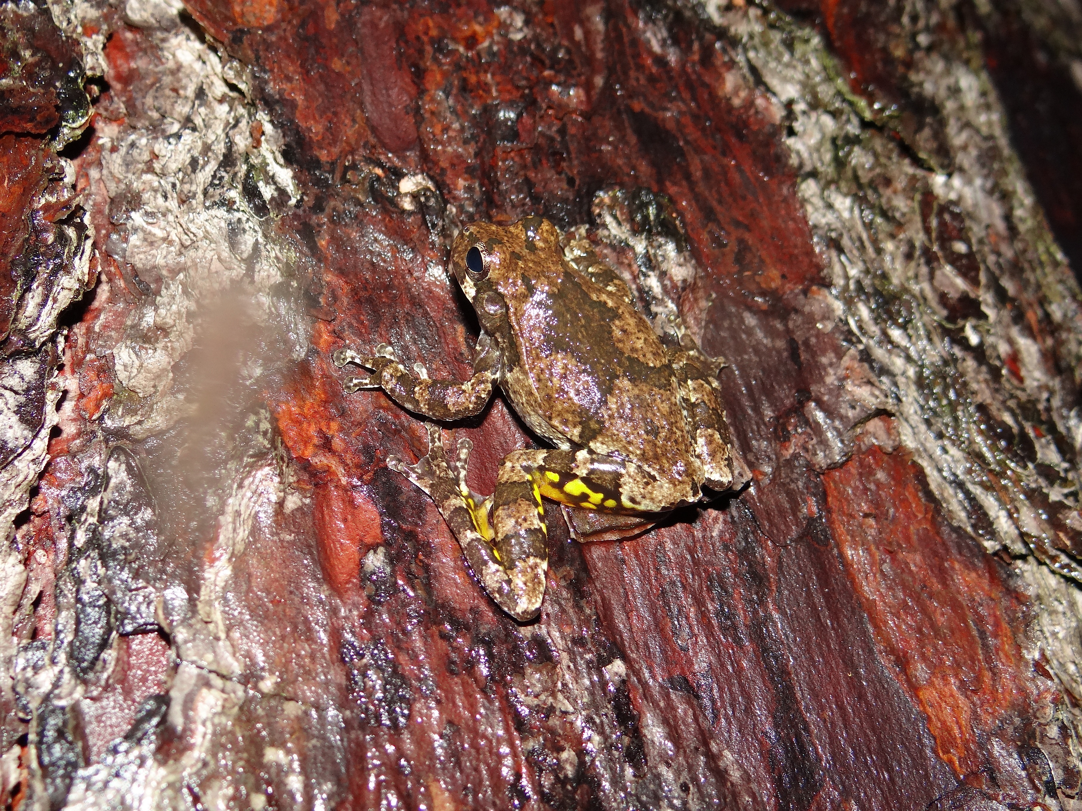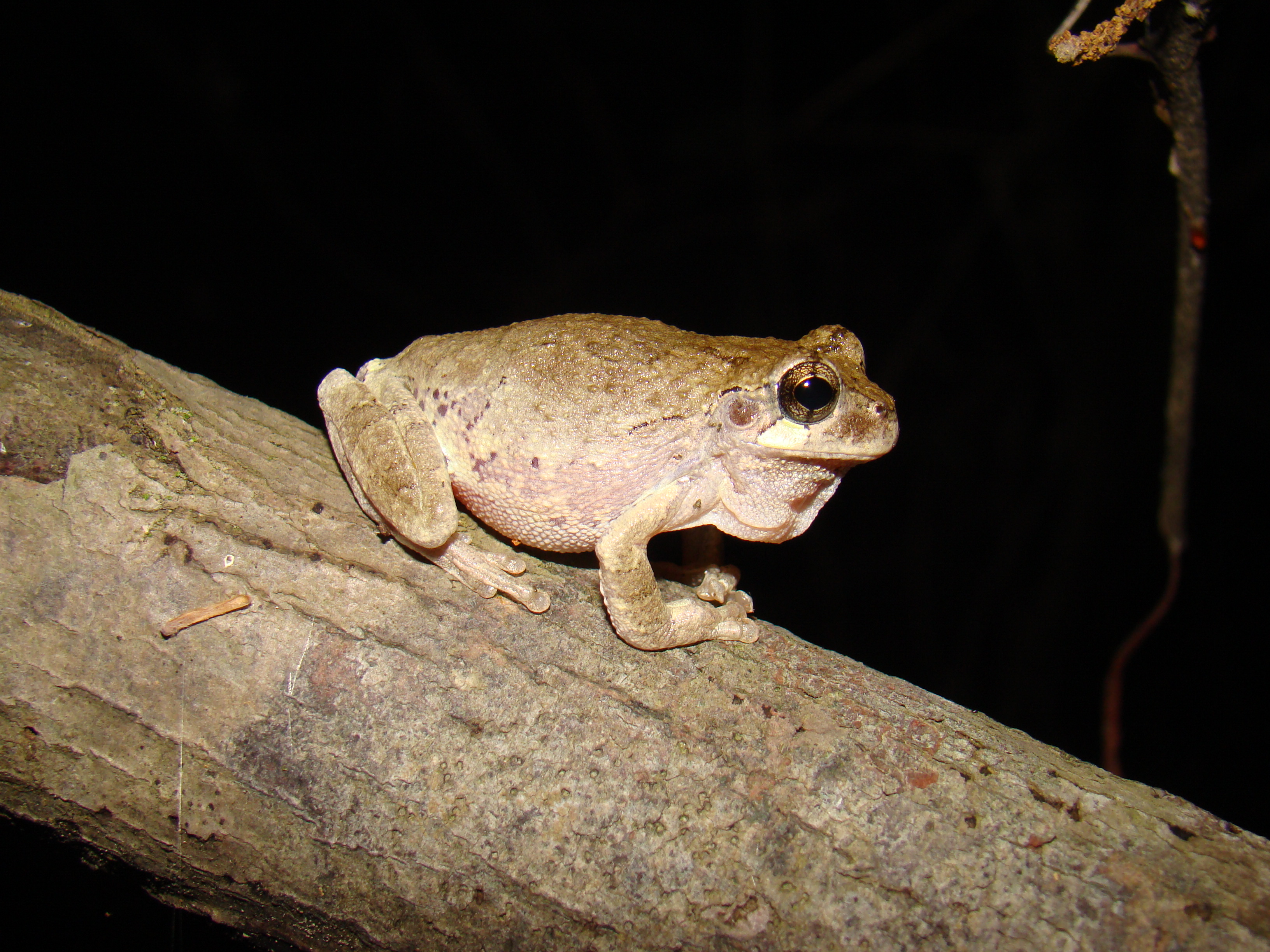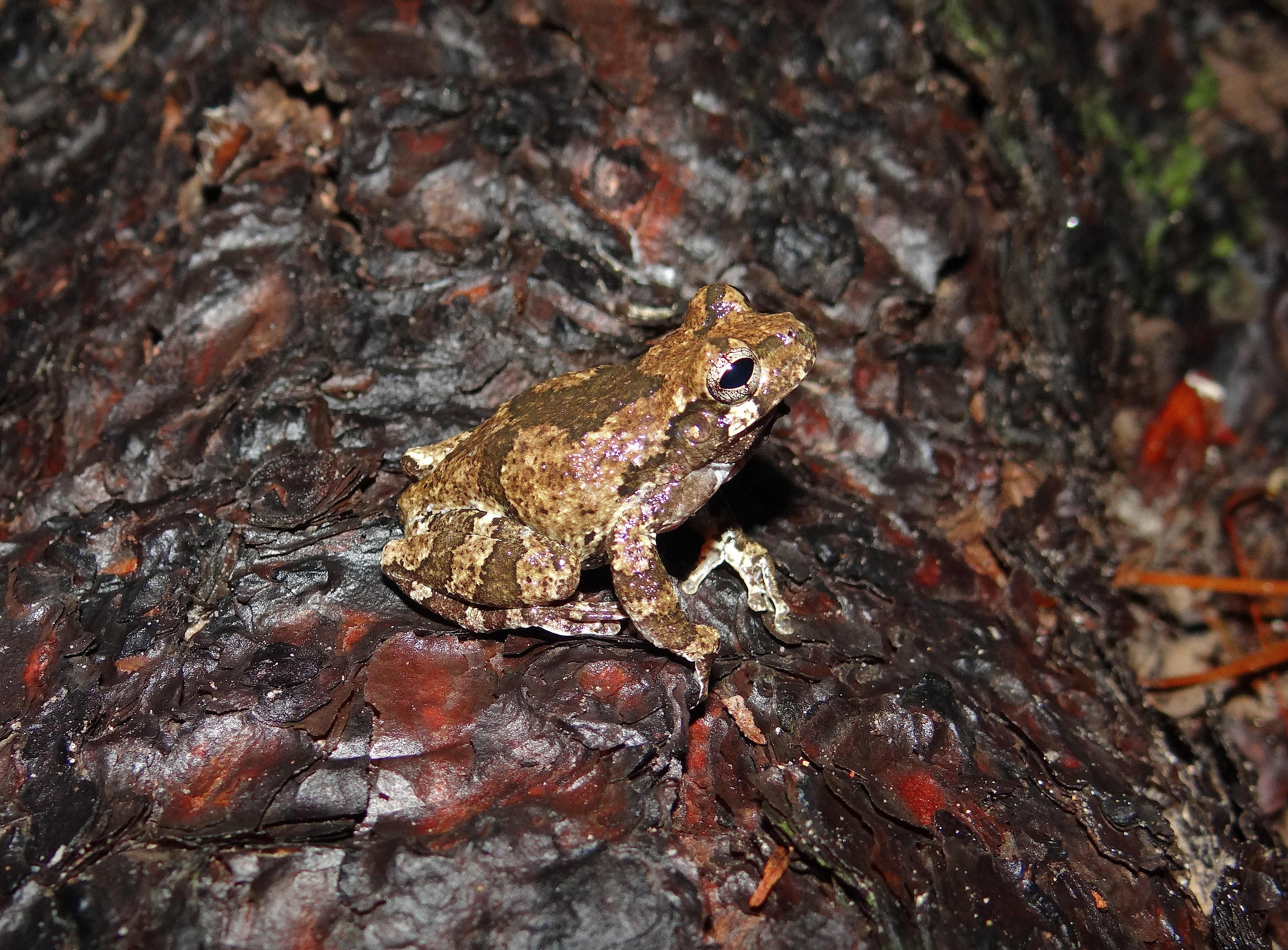 Adult Description: A medium-sized (maximum 2.4”) stout-bodied treefrog with variable coloration of pale to medium gray or brownish gray, but sometimes greenish, particularly in juveniles. Expanded, adhesive toe pads used for climbing. Skin is bumpy compared to Bird-voiced Treefrogs which look similar. Often with darker lichen-like irregular markings between eyes, on middle of back, and on sides which extend upwards over shoulders through eardrum to eye. A prominent white or light green patch below each eye. Deep yellow to orange markings on rear of thighs, which is typically concealed when at rest. Belly is dull white.