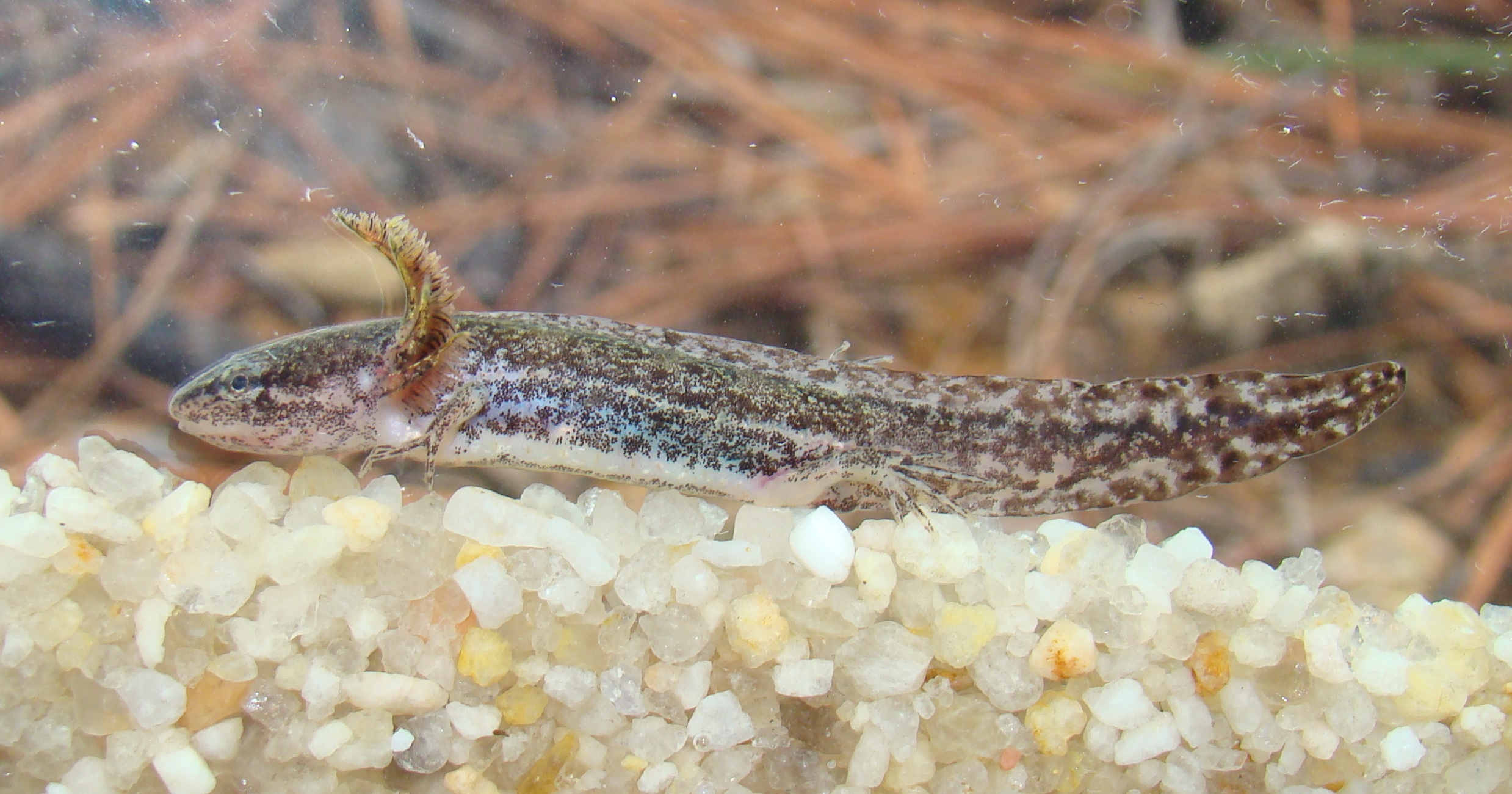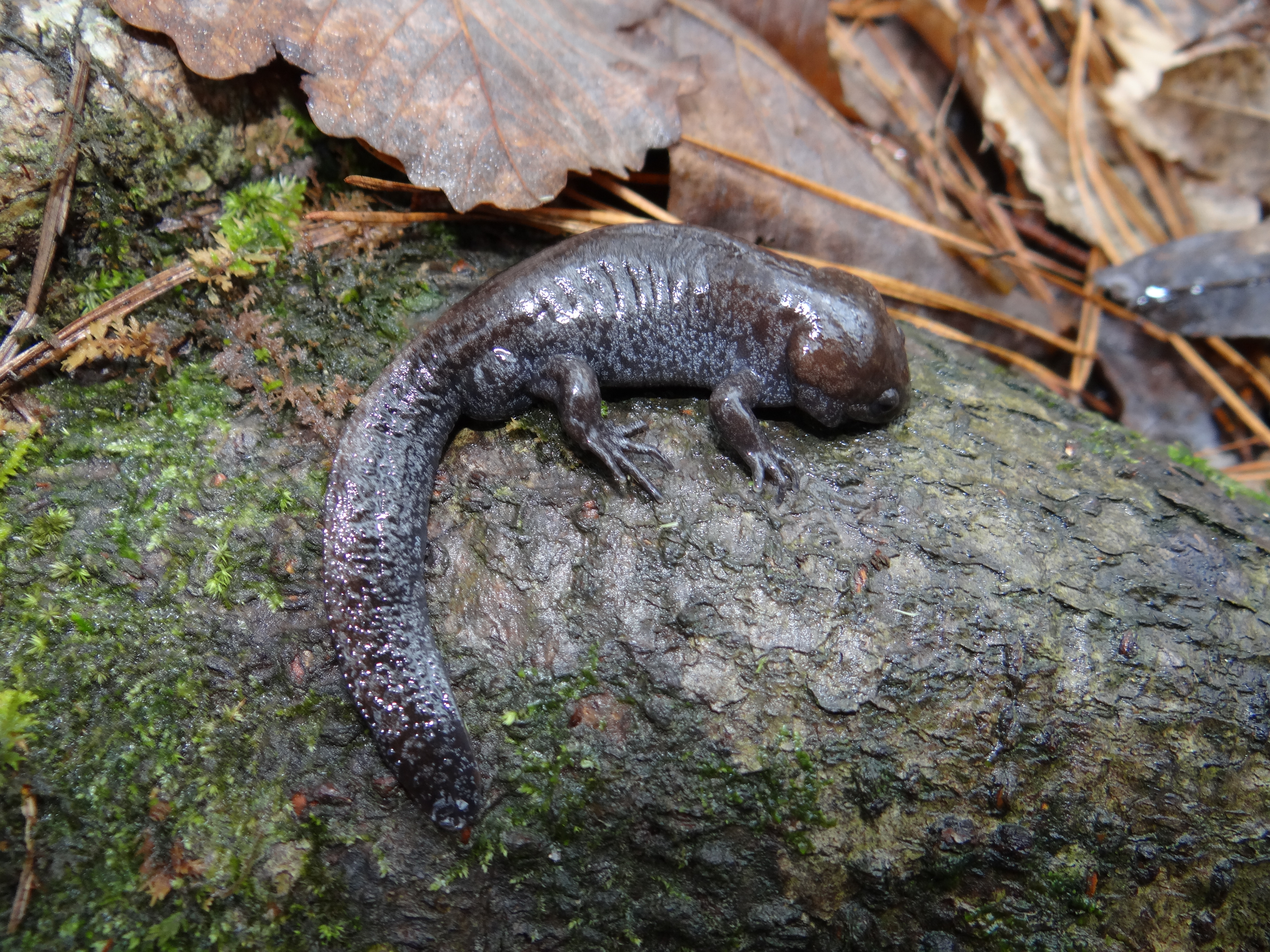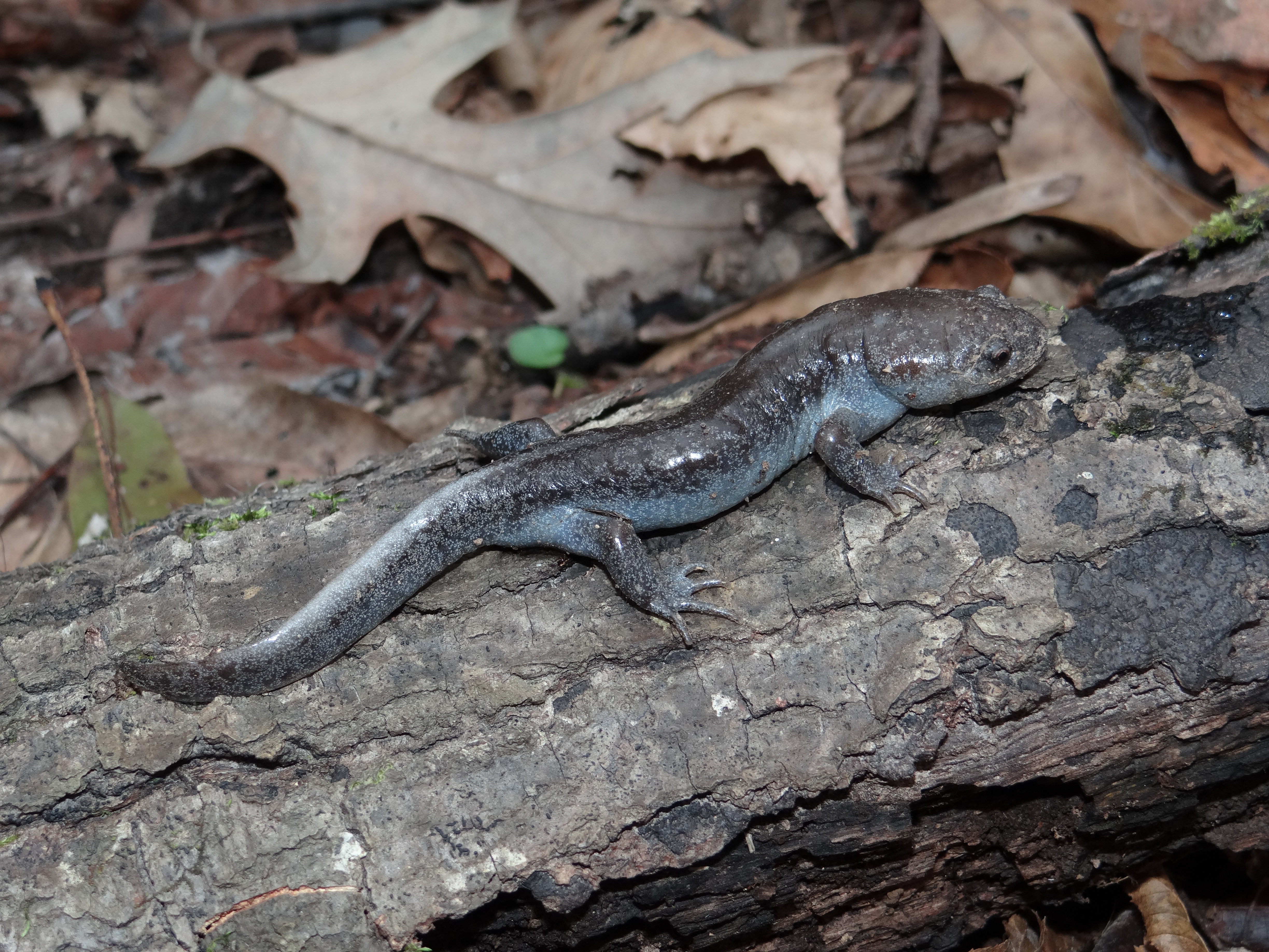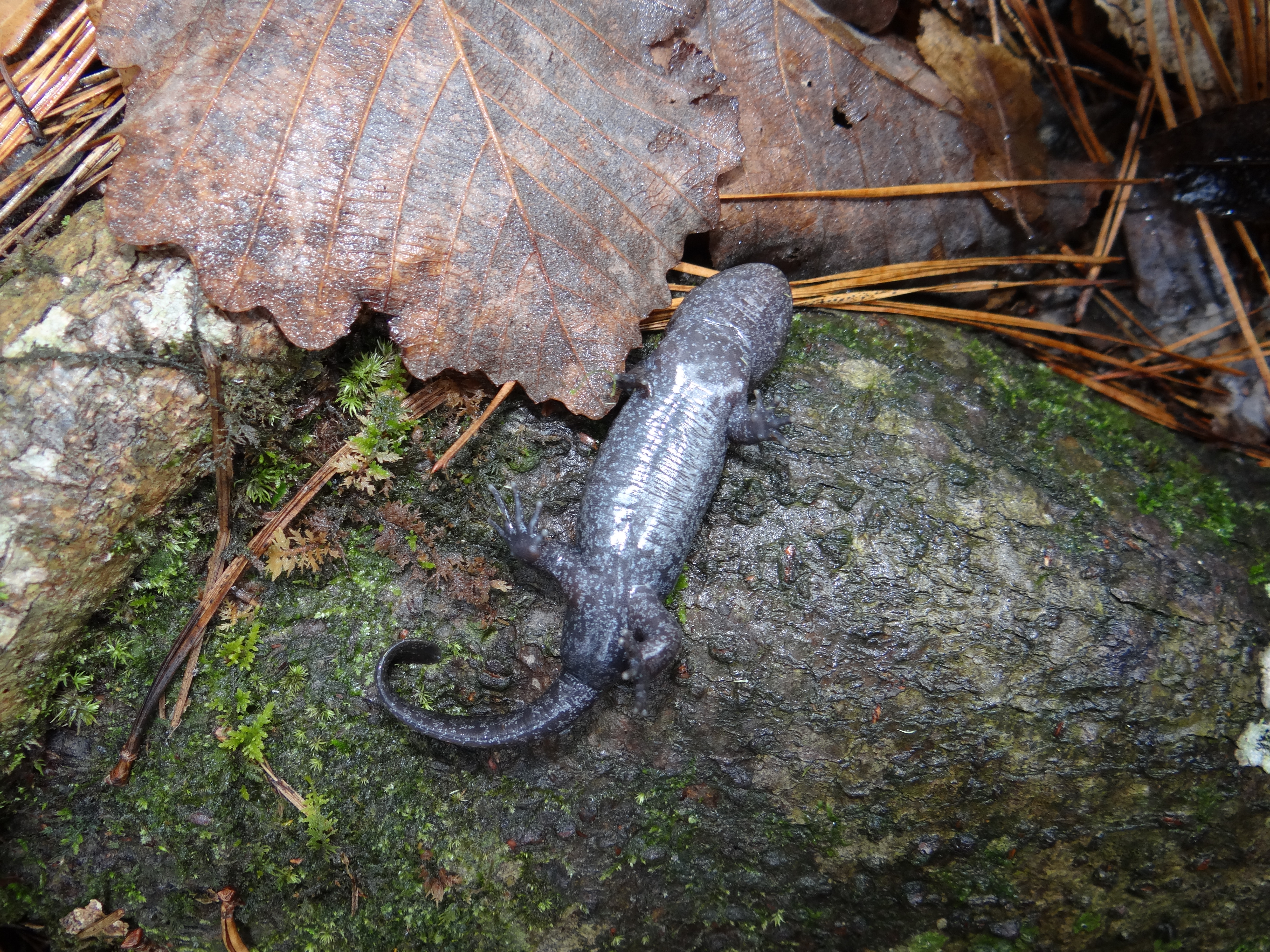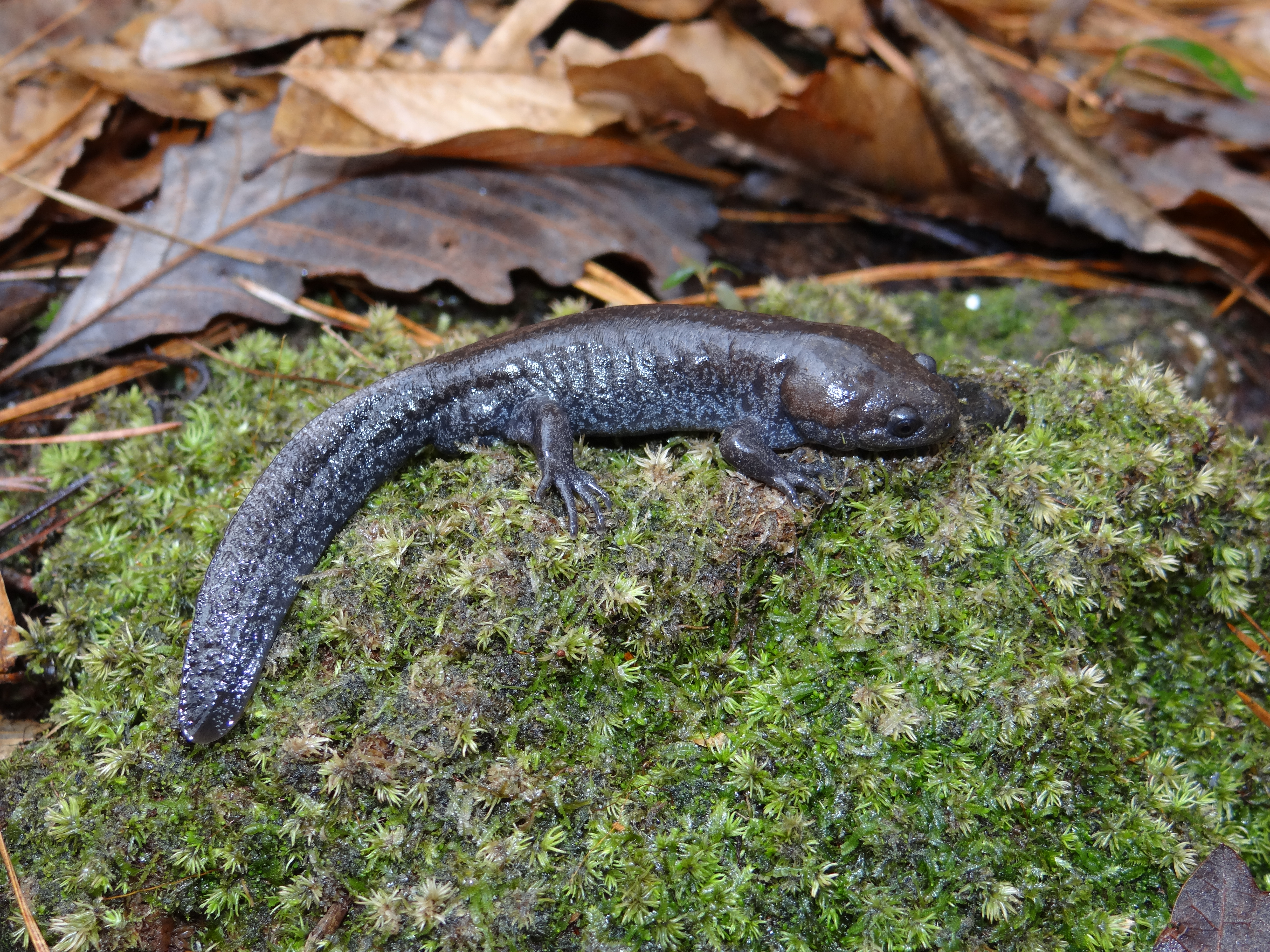 Adult Description: Medium-sized, robust salamander (maximum 4.8”) with broad head and short tail compared to most salamanders. Variable in coloration, from brown, dark gray, to nearly black with lighter blue-gray or silver flecks, most dense on sides, but on back and tail as well. Tail is laterally compressed, often lighter than surrounding color on top edge, and granulose. Usually 10 costal grooves, but sometimes 11. Belly is blue gray with many small blue-gray or silver flecks.
