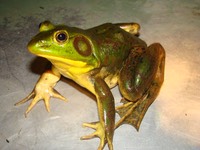 Adult Description: A large, robust frog (maximum 6.4”) with variable coloration of olive to dark brown. Heads are often green. Rounded dark spots are sometimes present on back. Adults may have tan stripes on sides of back, but much more prominent and consistent in juveniles, but juveniles usually lack much dark spotting. Skin is relatively smooth with no raised areas of skin on sides of back unlike North American Green Frogs, but they do have conspicuous raised skin around eardrum. Webbing of hind feet reaches end of toes unlike American Bullfrogs. More pointed snout than North American Bullfrogs. Thigh is striped unlike North American Bullfrogs. Hindlimbs with dark markings, but rarely crossbars. Belly is usually white, but some individuals have varying degrees of dark mottling present.