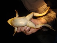 Natural History: Pig Frogs can be active day or night but are most active between dusk and dawn during warm, humid weather. They are indiscriminate and voracious feeders, taking any moving prey they can fit into their mouths, which includes various invertebrates, especially crawfish, but also documented are vertebrates such as fish, salamanders, frogs, lizards, and snakes. Snakes, alligators, wading birds, and mammals are likely predators. They breed in permanent water from March to August, when females lay 8,000–15,000 eggs in a surface film. Eggs hatch in 2–3 days and the timing of tadpoles to metamorphosis is unknown, but it is likely that overwintering is common, especially for late breeders, before transformation the following spring or summer. Maturity likely takes 1–2 years. Wild longevity is likely 5–6 years.