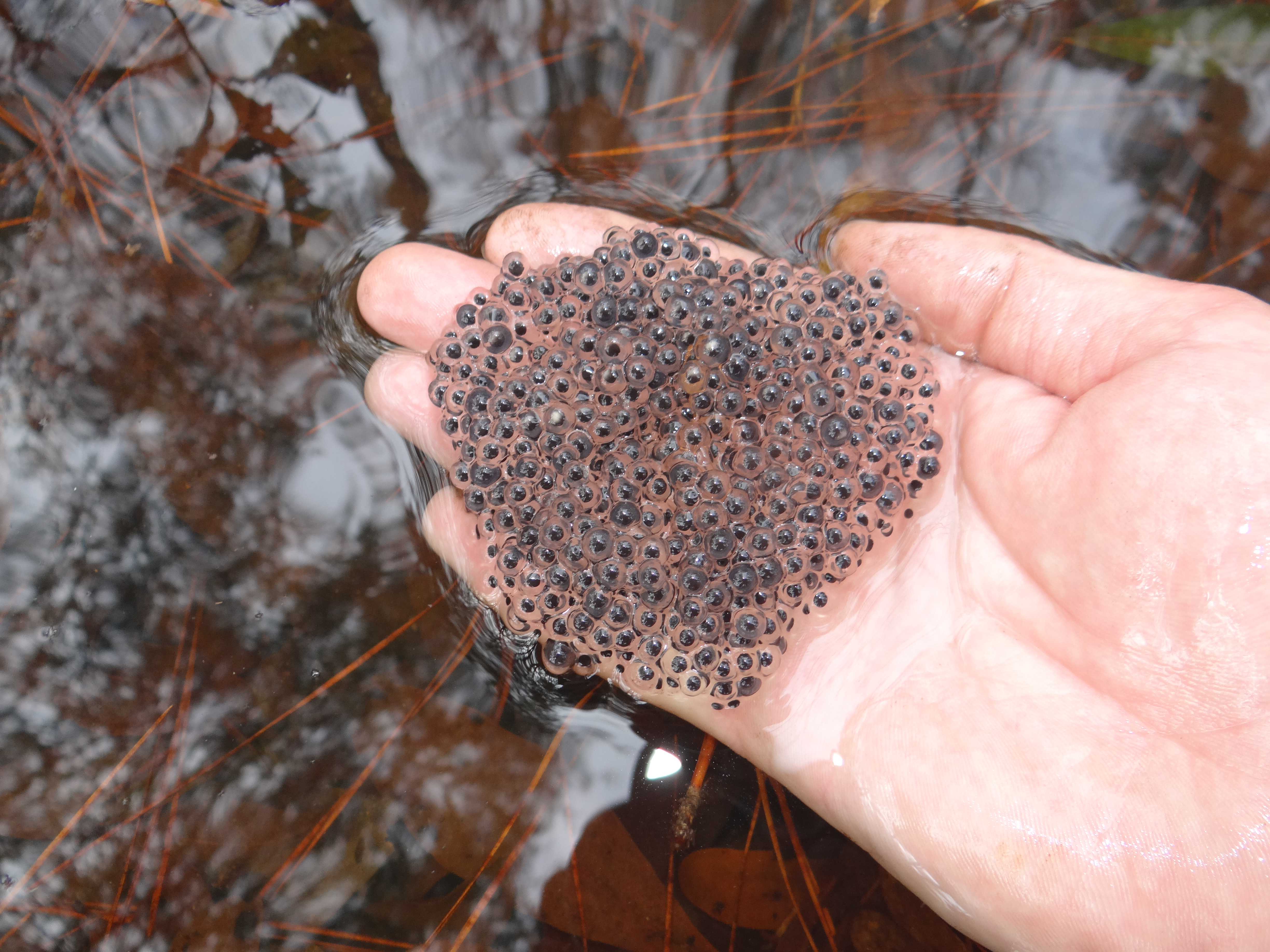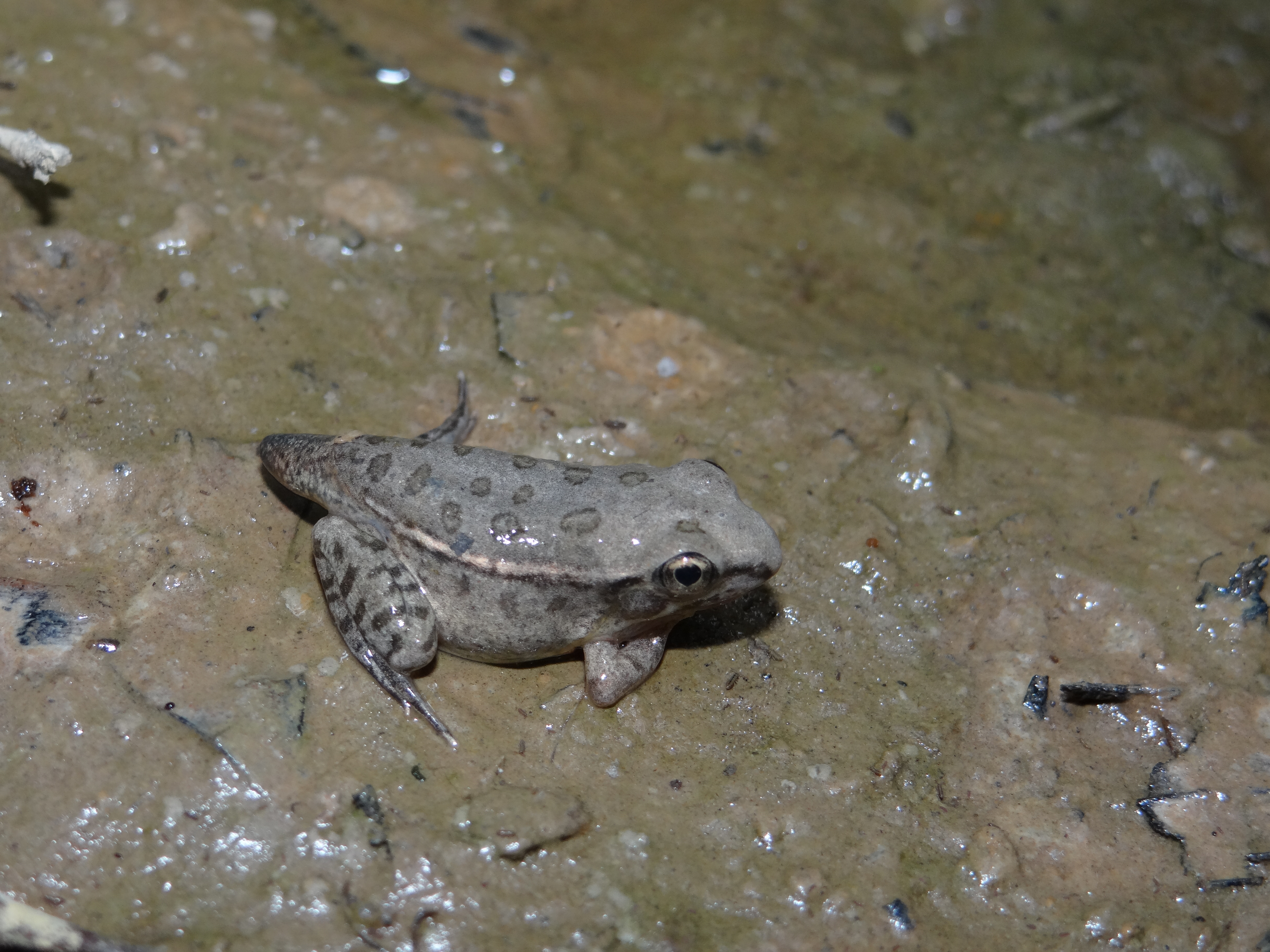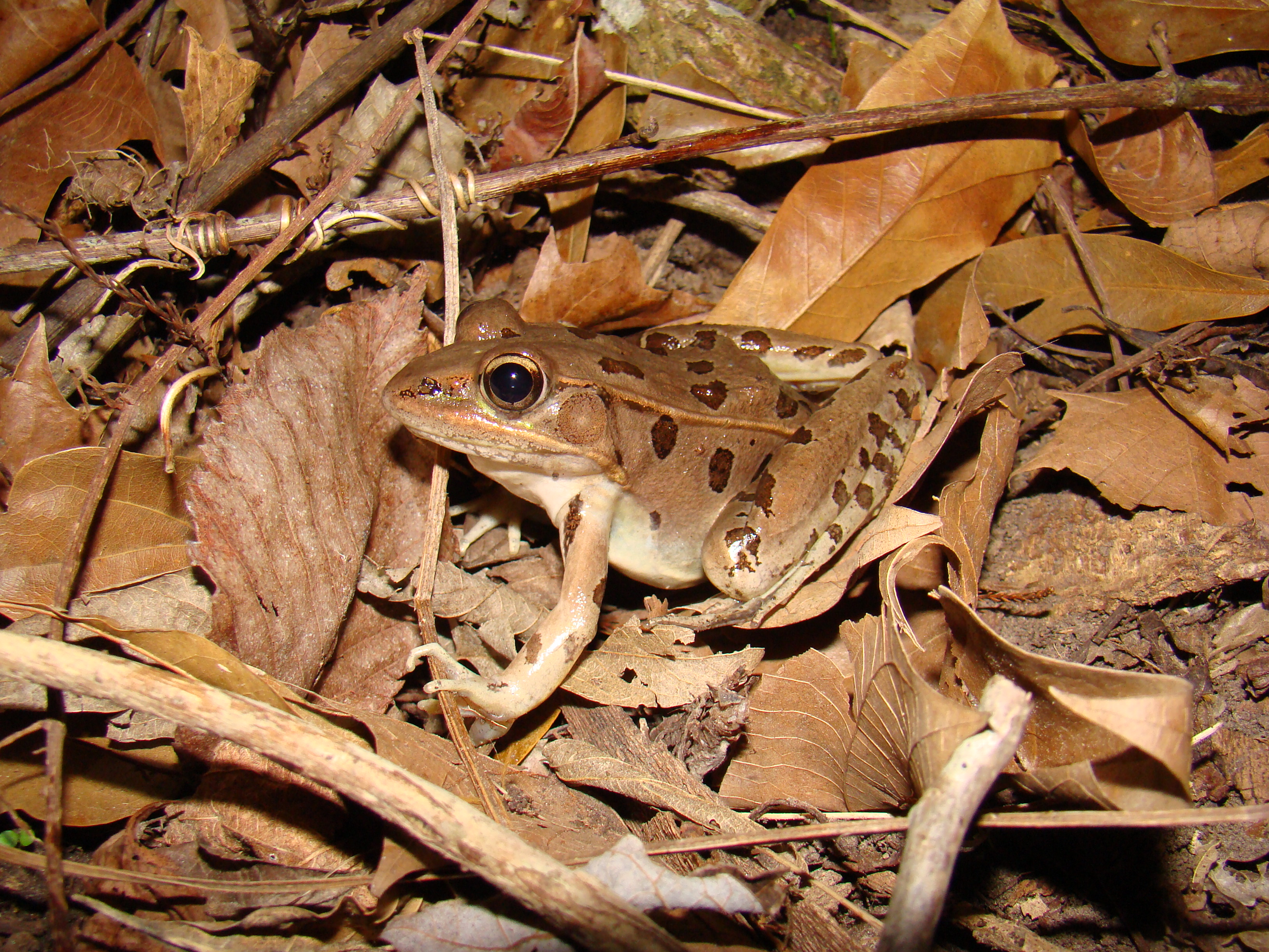Natural History: Southern Leopard Frogs are primarily nocturnal, especially in warmer months, and may hide in grassy vegetation near water during the day. They will wander relatively far from water to feed if there is enough cover and moisture. Documented prey includes a variety of arthropods and invertebrates as well as fish, salamanders, and frogs. Snakes, turtles, birds, and mammals are known predators. They can breed nearly any time of year, but the bulk of reproduction typically occurs in fall and winter. They use a variety of wetland habitats to breed but prefer ephemeral ponds and other fishless water bodies. Females lay 900–6,000 eggs in firm, globular clusters that may be attached to vegetation near the surface or rest on the shallow substrate. Eggs hatch in about 7–10 days and tadpoles metamorphose in about 2–3 months. Maturity may be less than 1 year. Wild longevity is unknown but may be up to 3 years.