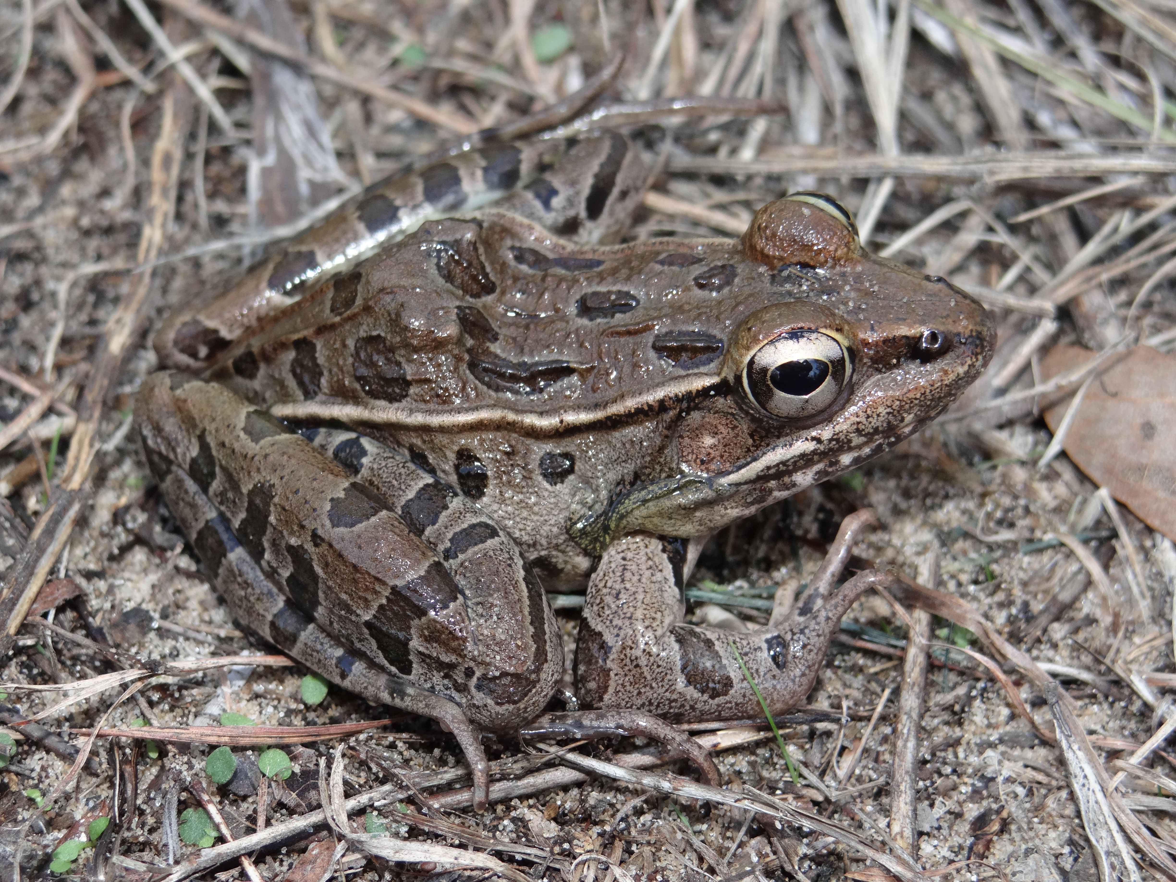Adult Description: A medium-sized frog (maximum 5”) of variable coloration of shades of brown, gray, or green. Smooth skin with prominent raised area of pale to golden skin on each side of back extending from behind eye to groin. Occasionally other smaller and shorter raised areas of skin in middle of back with coloration not distinct from body. Dark round or oval spots, not squarish like Pickerel Frog, of varying sizes scattered randomly on back and sides. Round spot may be present on one or both sides of skin between eyes but not usually on top of snout. Pale stripe on upper lip extending at least to below eardrum and a dark patch behind eye and eardrum. Center of eardrum usually with white spot unlike Pickerel Frog. Hindlimbs with distinct dark crossbars. Belly is white with no yellowish wash like Pickerel Frog.