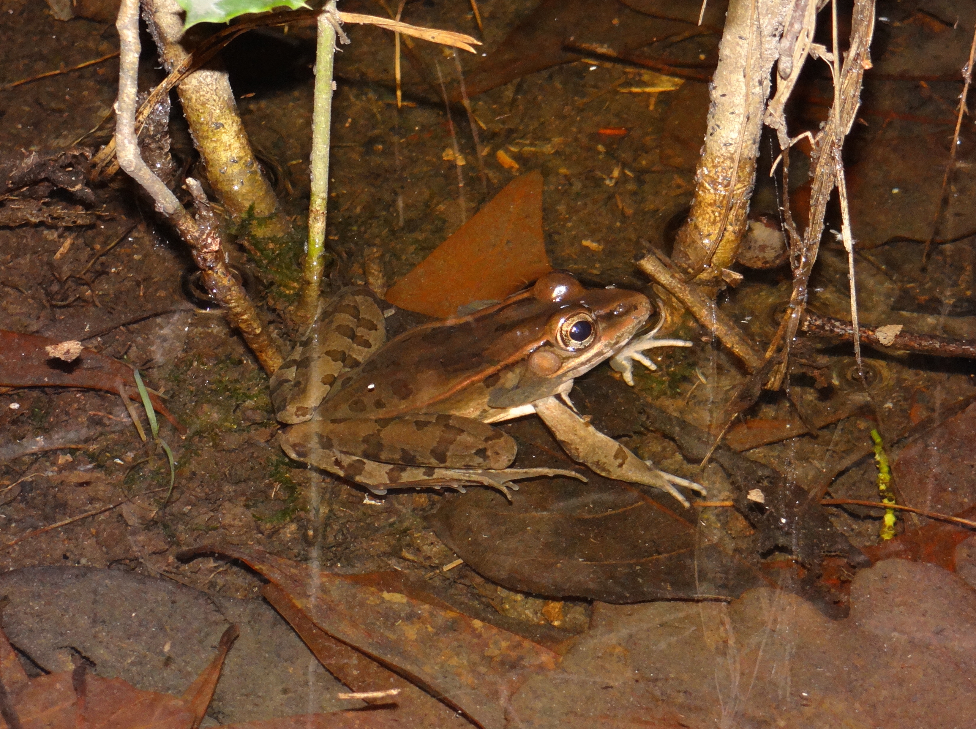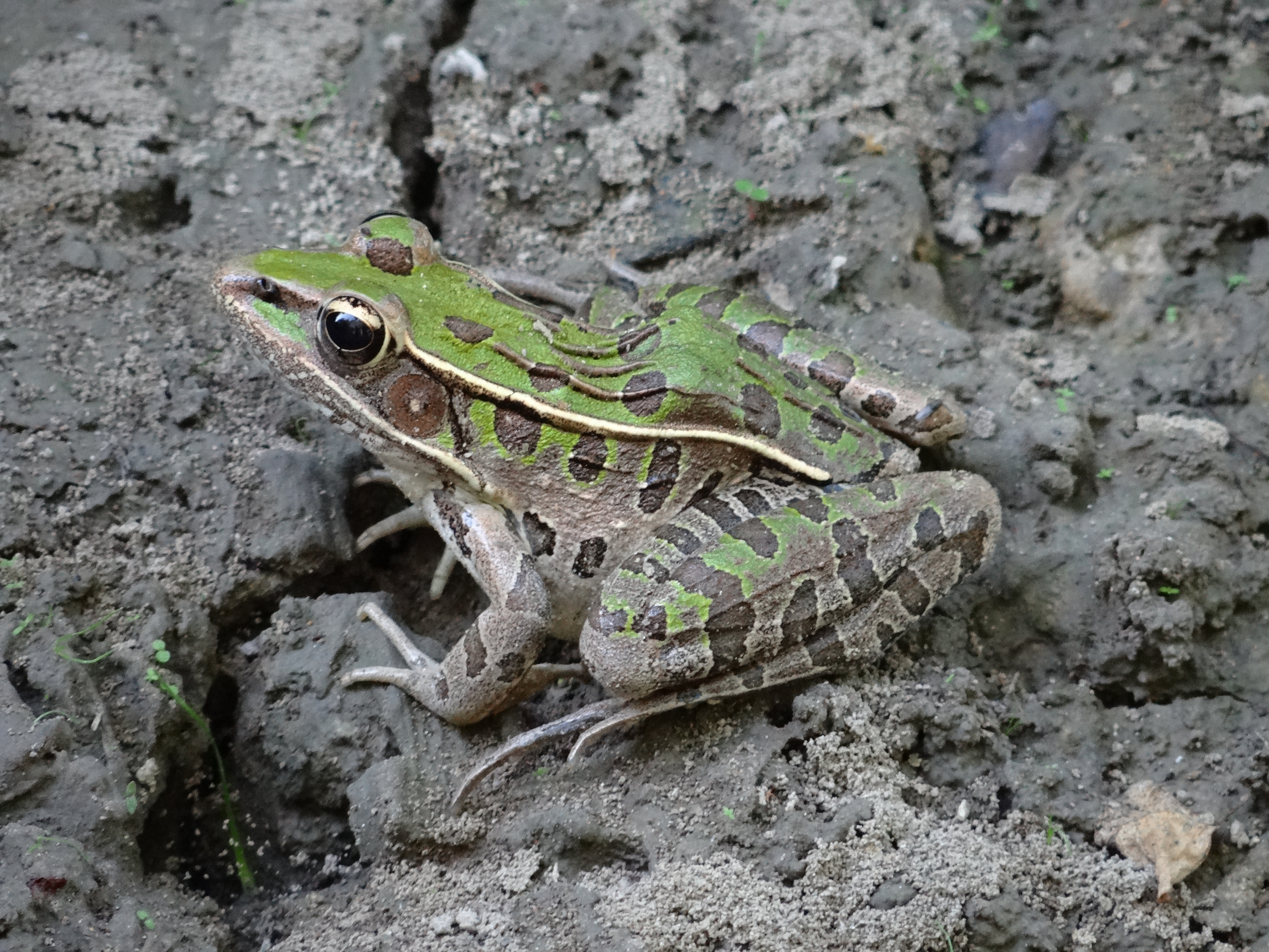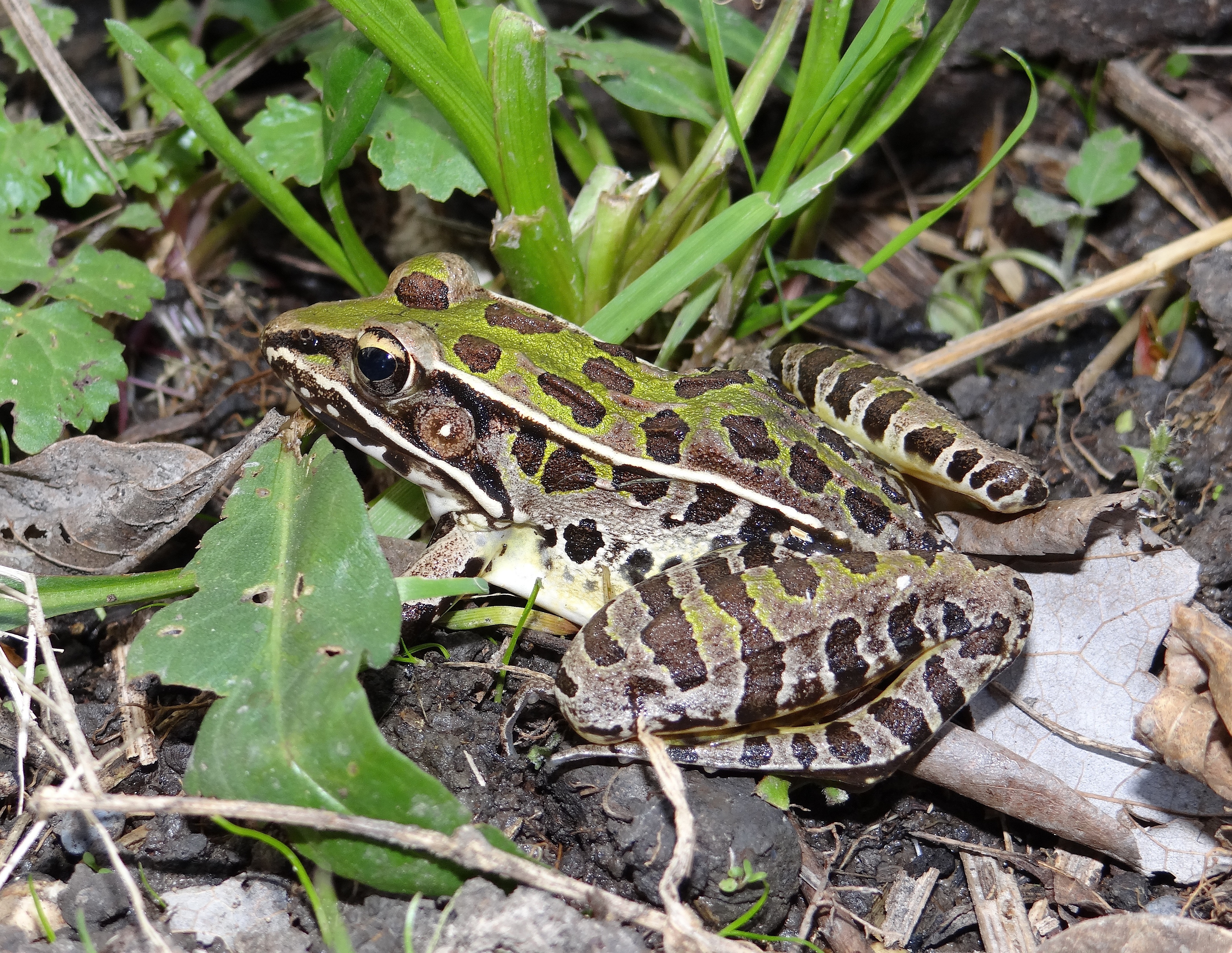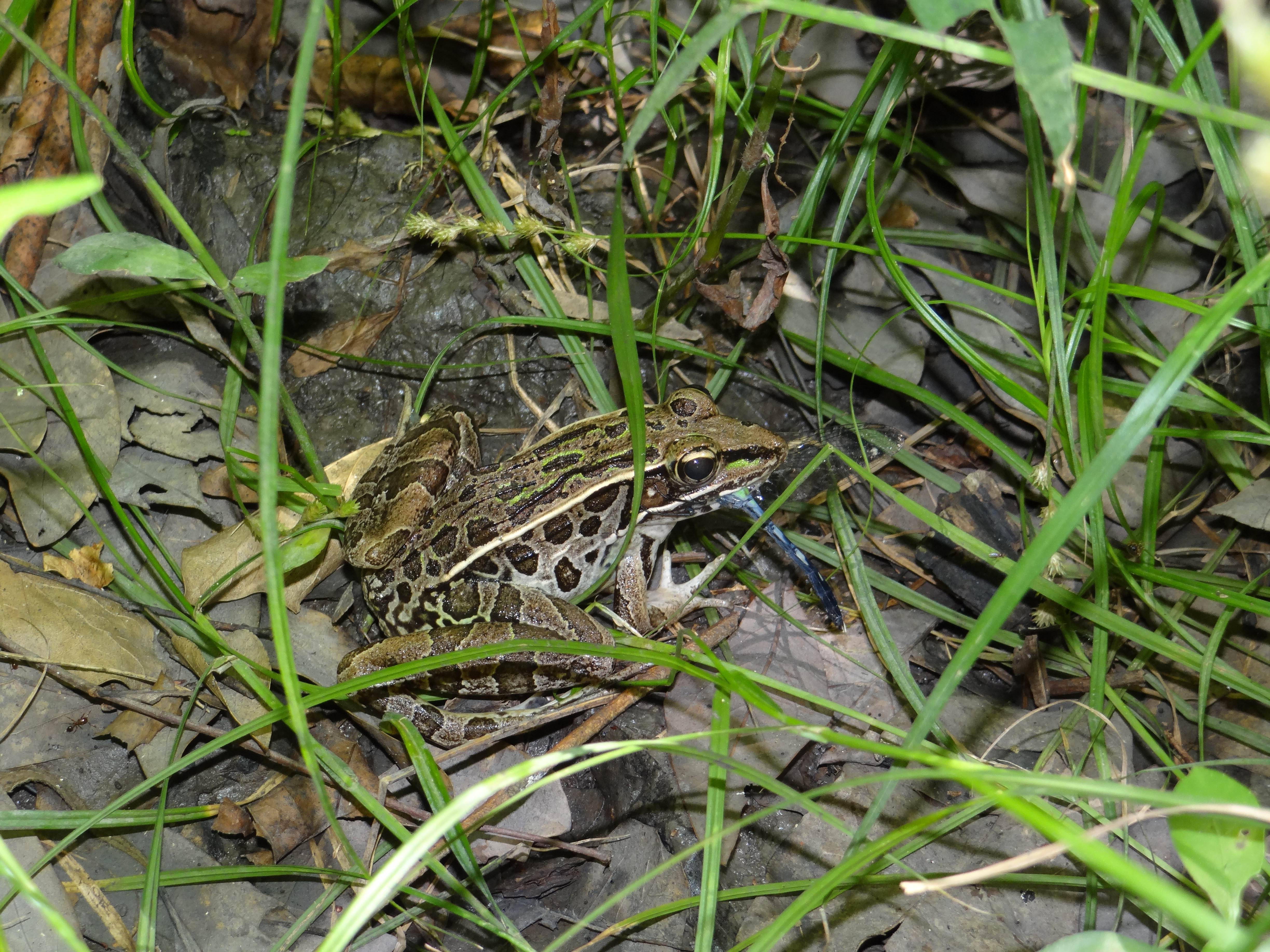 Best Time and Place to Observe: This frog is often encountered during warmer days in grassy areas near water, but leopard frogs often sense perceived danger before being seen and escape quickly by making several massive leaps. Though their breeding choruses can be impressively loud they are quick to silence when approached, making observing them calling difficult. It is typically easier to find and approach them without them jumping away at night in many of the same areas where it may be difficult during the day.