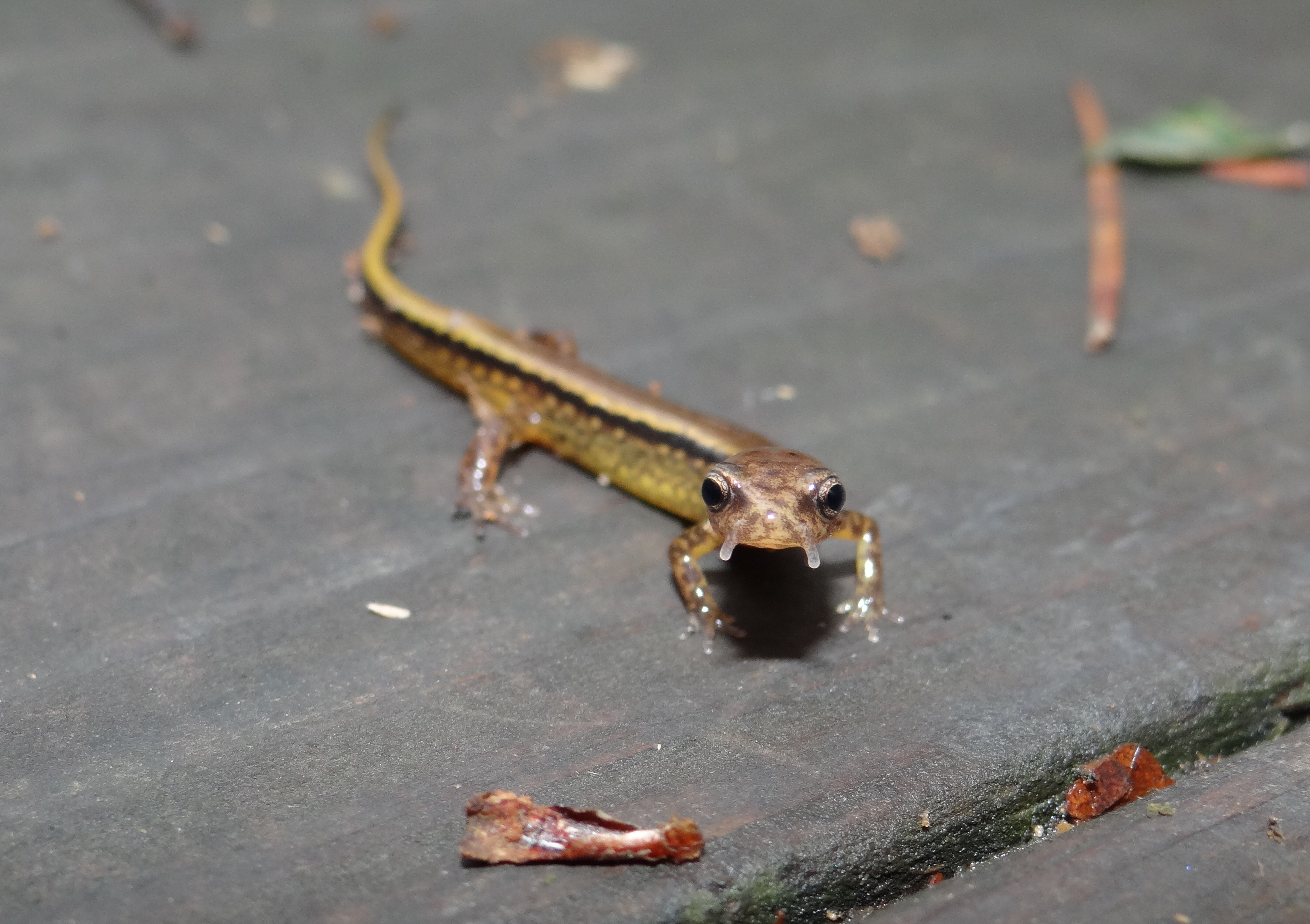 Adult Description: Small, slender salamander (maximum 4.3”) of yellow, gold, or tan coloration, with a black or brown line extending on each side from back of eye through most of tail. Few to many black or brown flecks may be present on top of head and middle of back between lines. On sides below dark lines usually dull yellow without dark markings. Tail becomes more laterally compressed towards tip. 13–14 costal grooves. Five toes on hindlimbs can help differentiate them from Dwarf Salamanders, which have four. During breeding season adult males often have a pair of cirri extending downward from outer edge of upper lip. Belly is yellow and somewhat translucent.