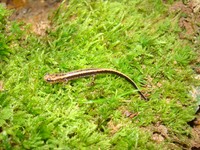 Adult Description: Slender, but long salamander (maximum 7.9”) with yellow to tan coloration on top of head, body, and top of tail. A dark brown or black line extends down middle of back from behind head to base of tail. Thicker dark brown or black lines run length of body and tail on each side, with lighter markings often on dark stripes on tail. Dark spots or markings are usually present on top of head. Lower sides are white or yellow with darker markings usually present. Tail becomes more laterally compressed towards tip. Tail makes up nearly two-thirds of body length. 13–14 costal grooves. Belly is pale to yellow with few to many gray markings.