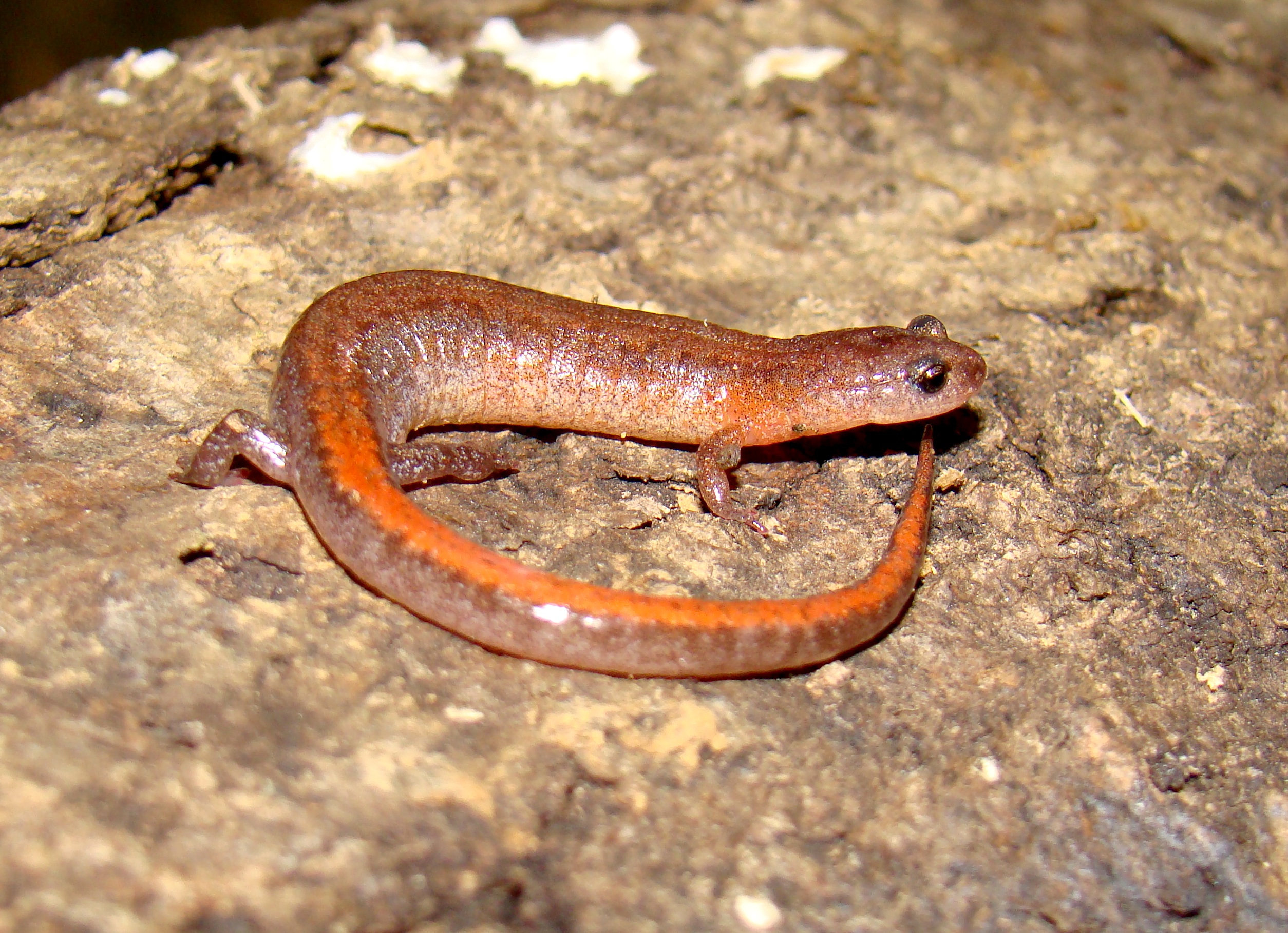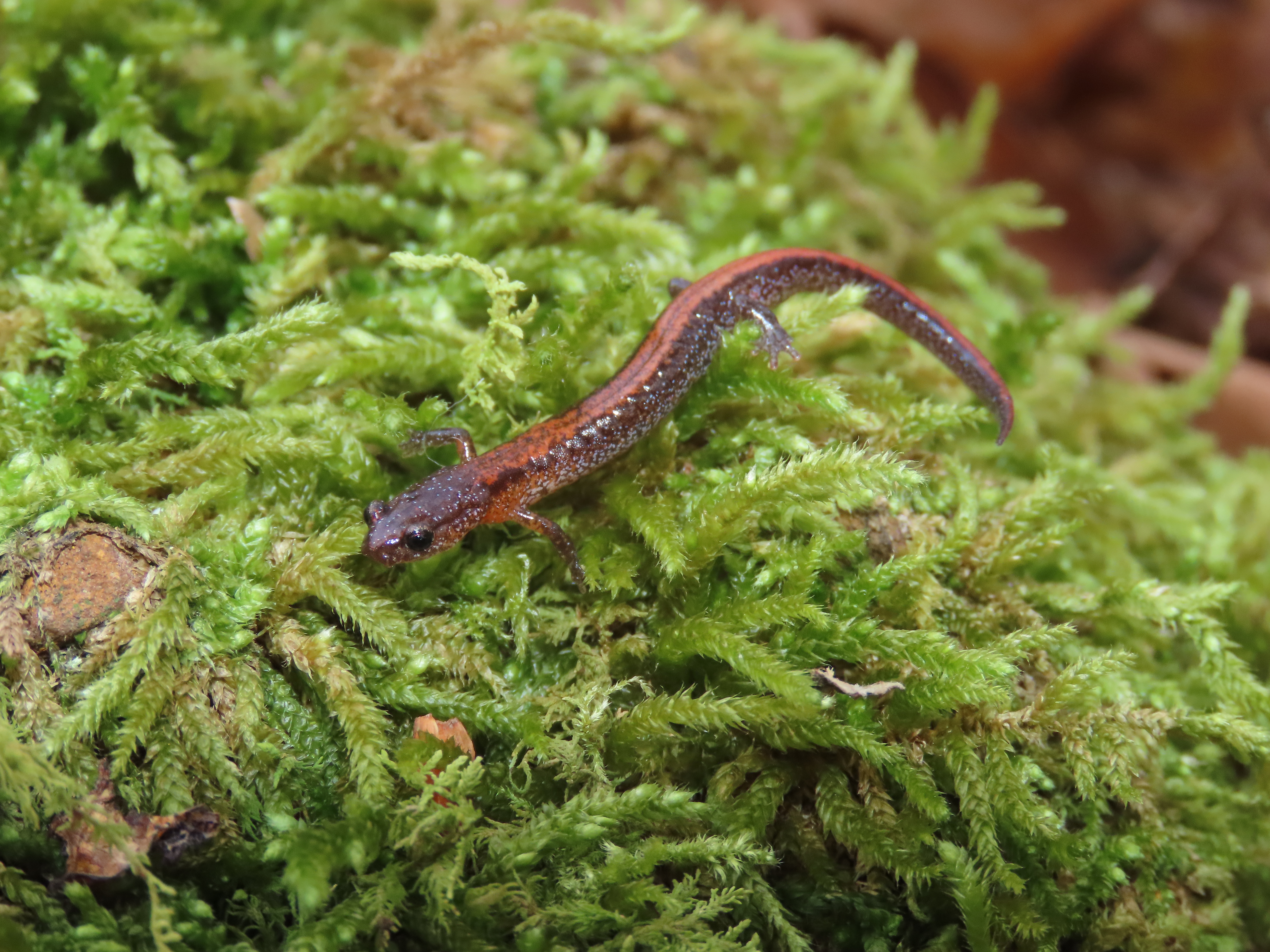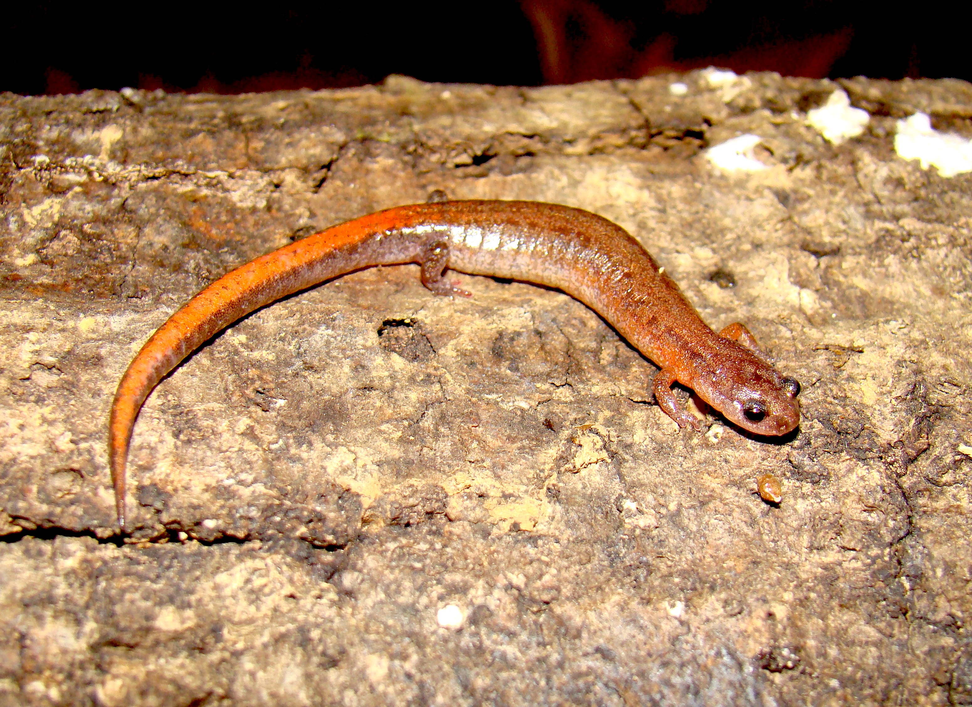 Adult Description: Small, slender salamander (maximum 3.2”) with short legs, a round tail in cross section, and an orange to reddish stripe on top from neck to tail tip, usually more vibrant towards tail, often with dark margins. Orange coloration may also be found on neck and base of forelimbs. Sides are dark gray with scattered pale flecks. 18 costal grooves. Adult males possess mental glands. Belly is somewhat translucent and mottled with gray and pale markings.