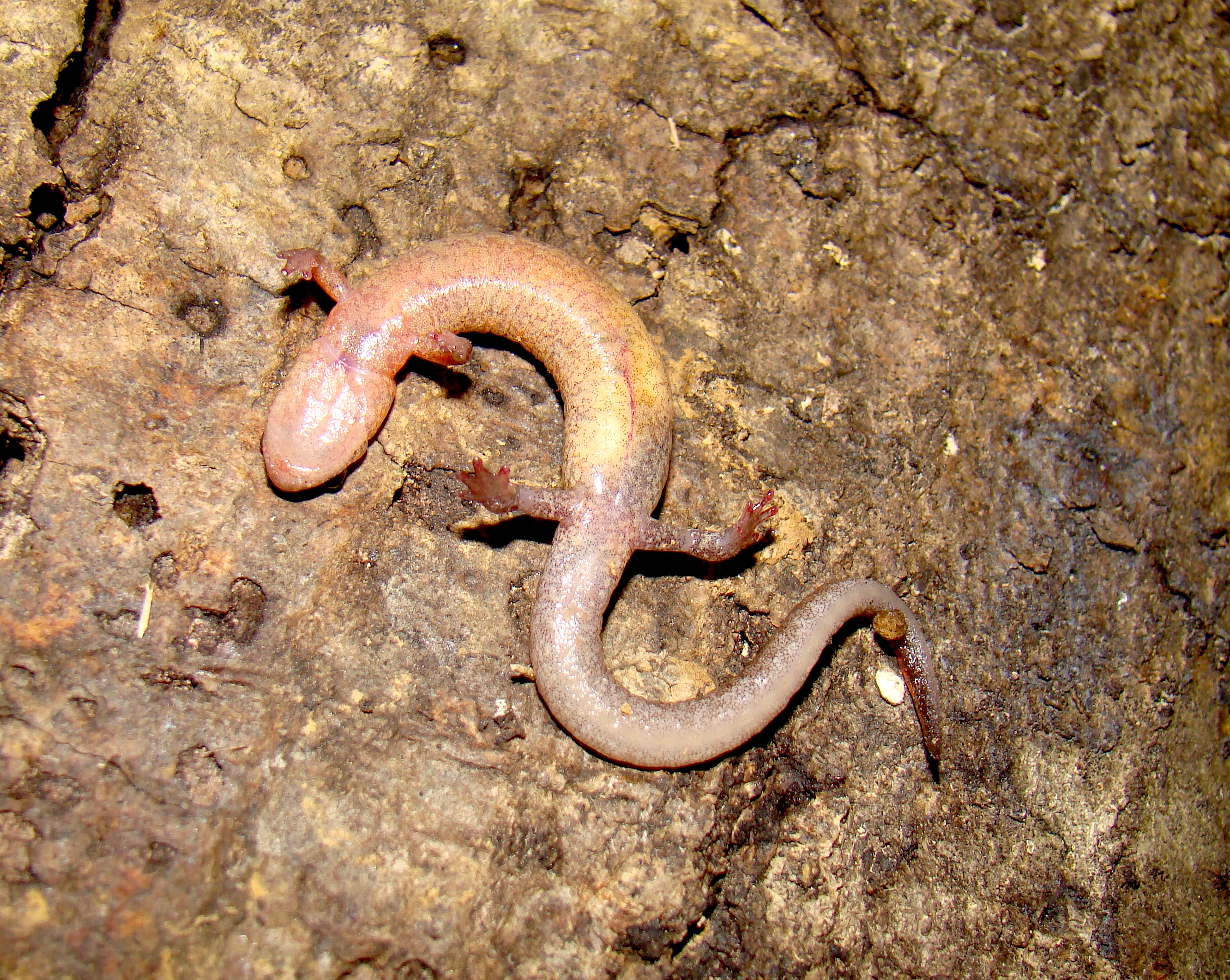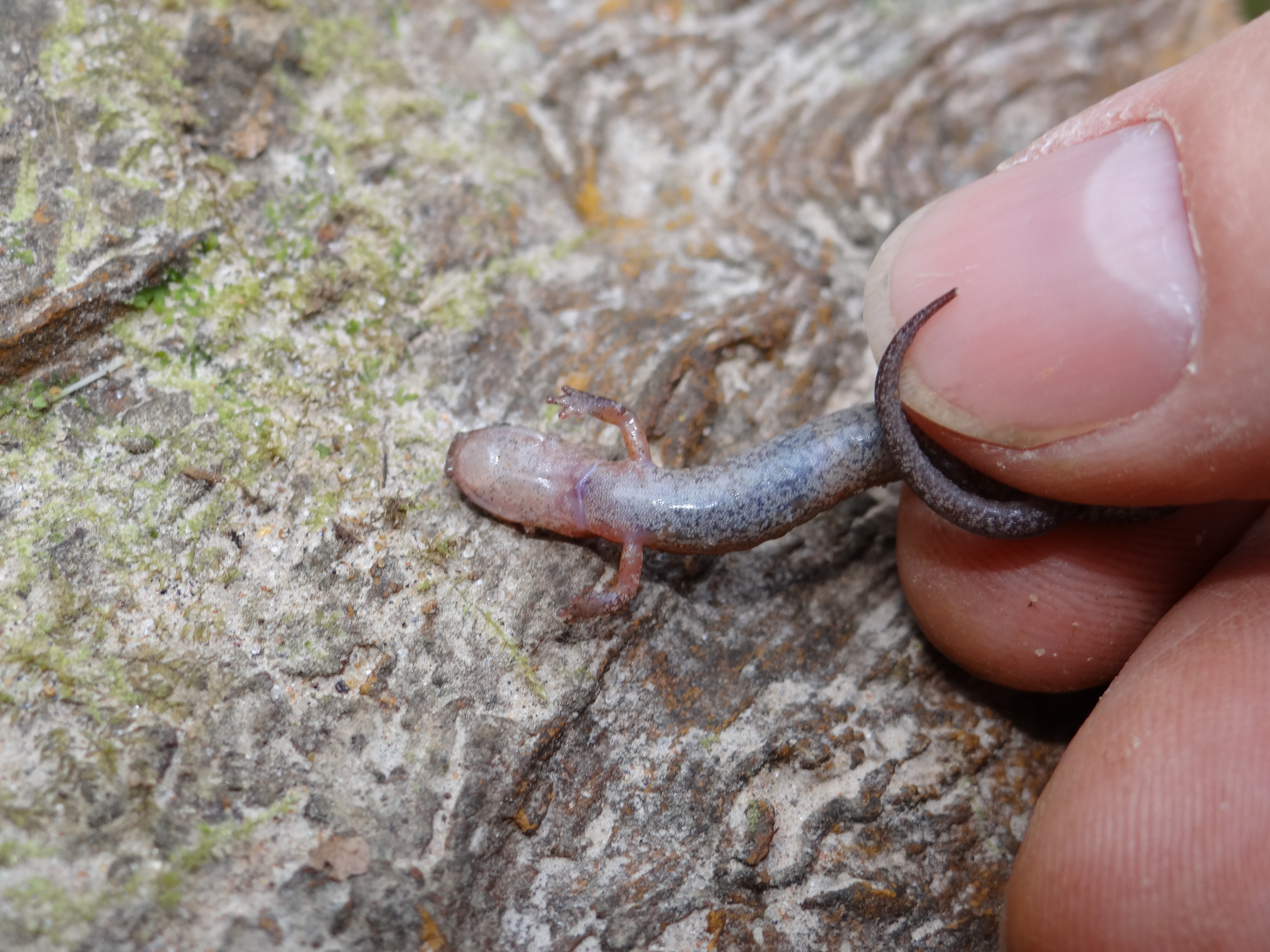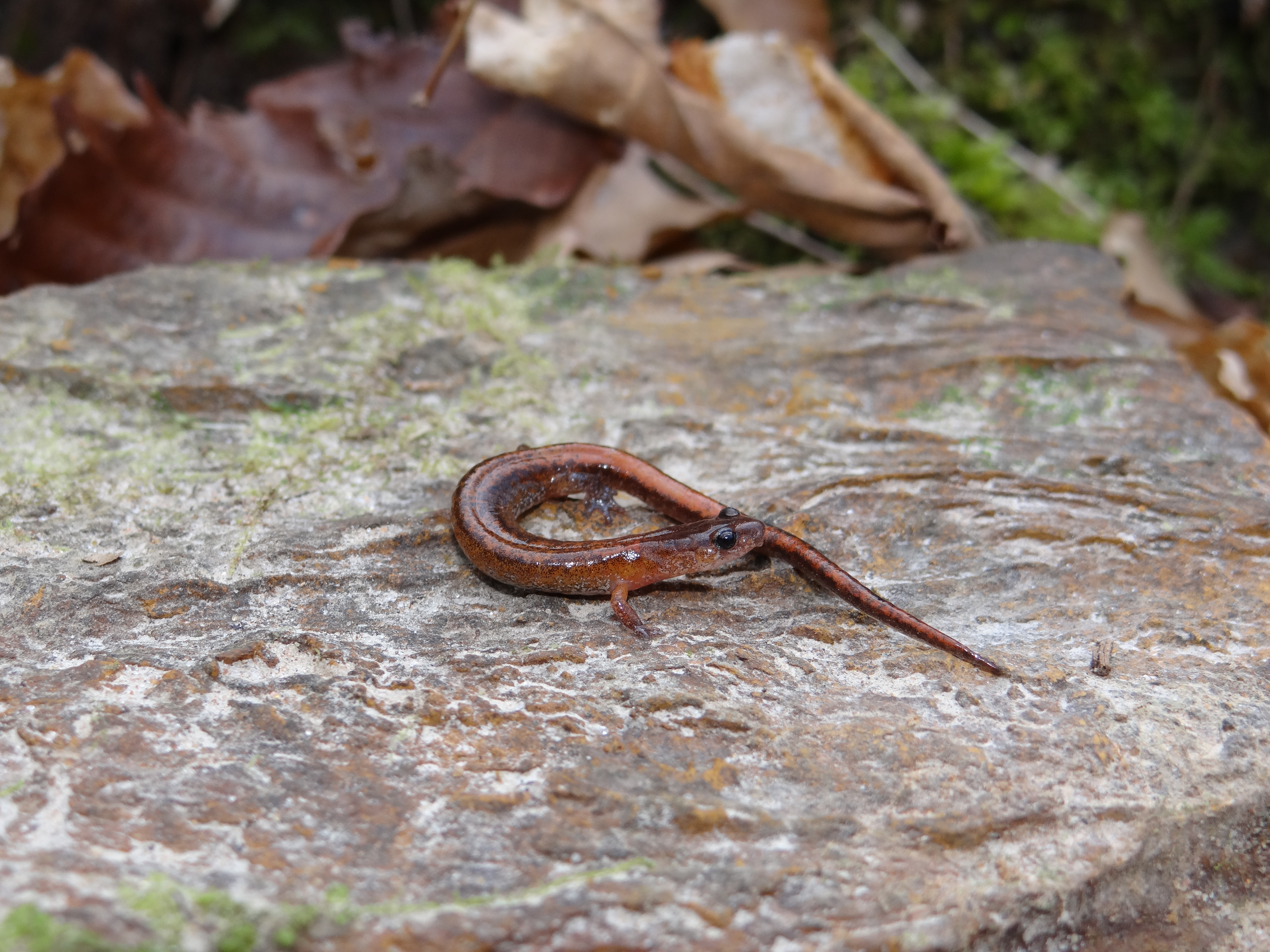 Adult Description: Small, slender salamander (maximum 3.2”) with short legs, a round tail in cross section, and an orange to reddish stripe on top from neck to tail tip, usually more vibrant towards tail, often with dark margins. Orange coloration may also be found on neck and base of forelimbs. Sides are dark gray with scattered pale flecks. 18 costal grooves. Adult males possess mental glands. Belly is somewhat translucent and mottled with gray and pale markings.