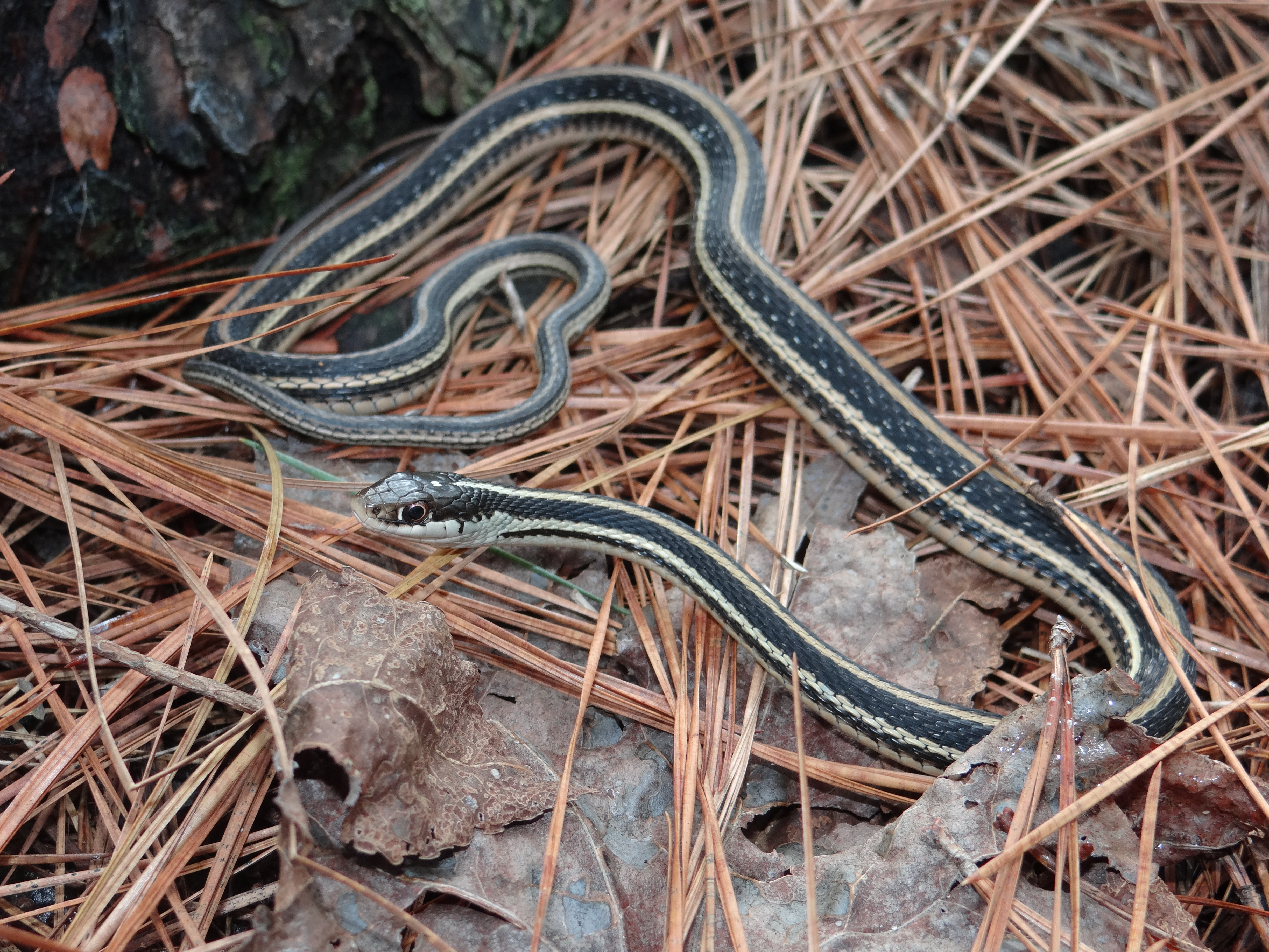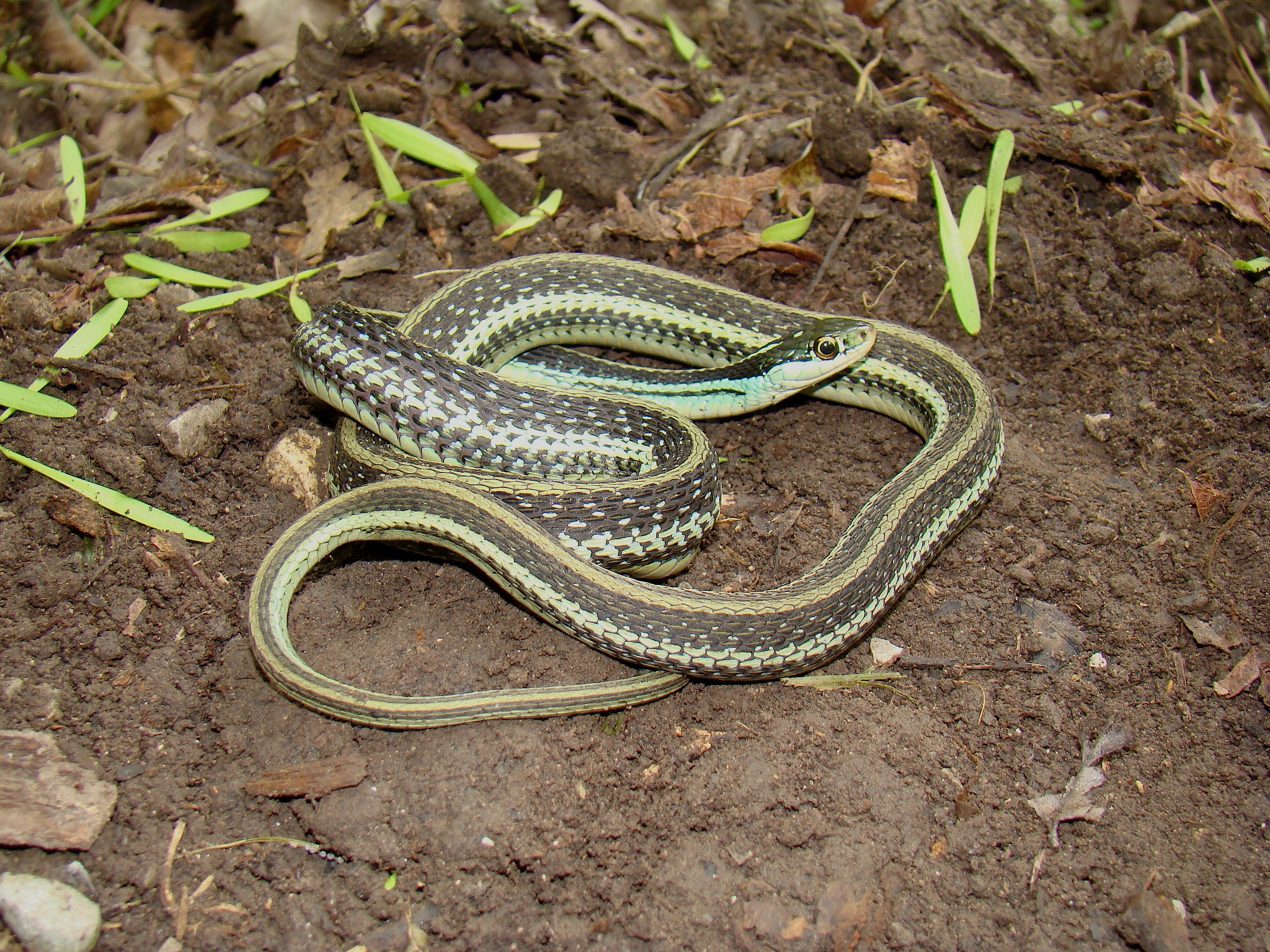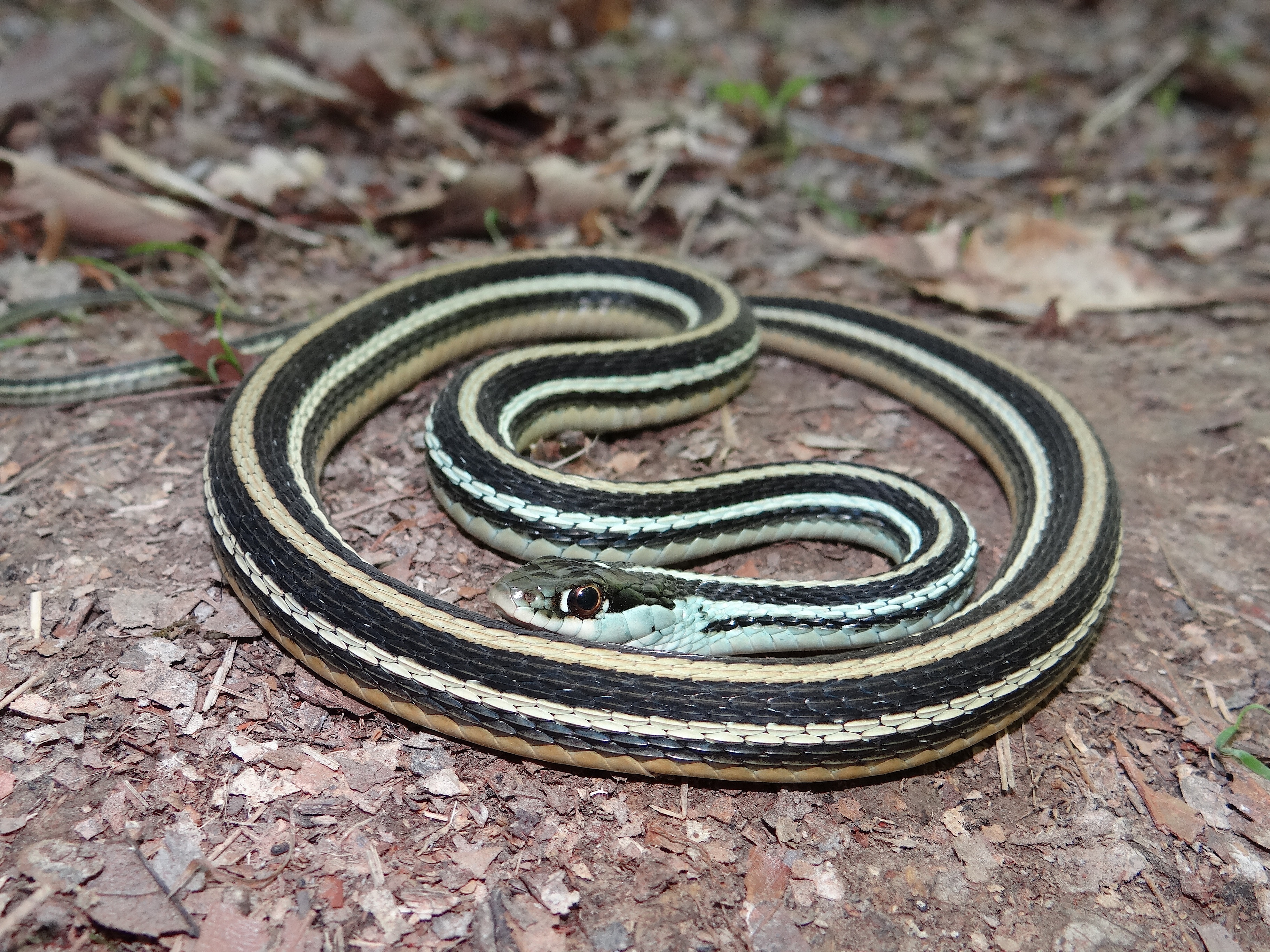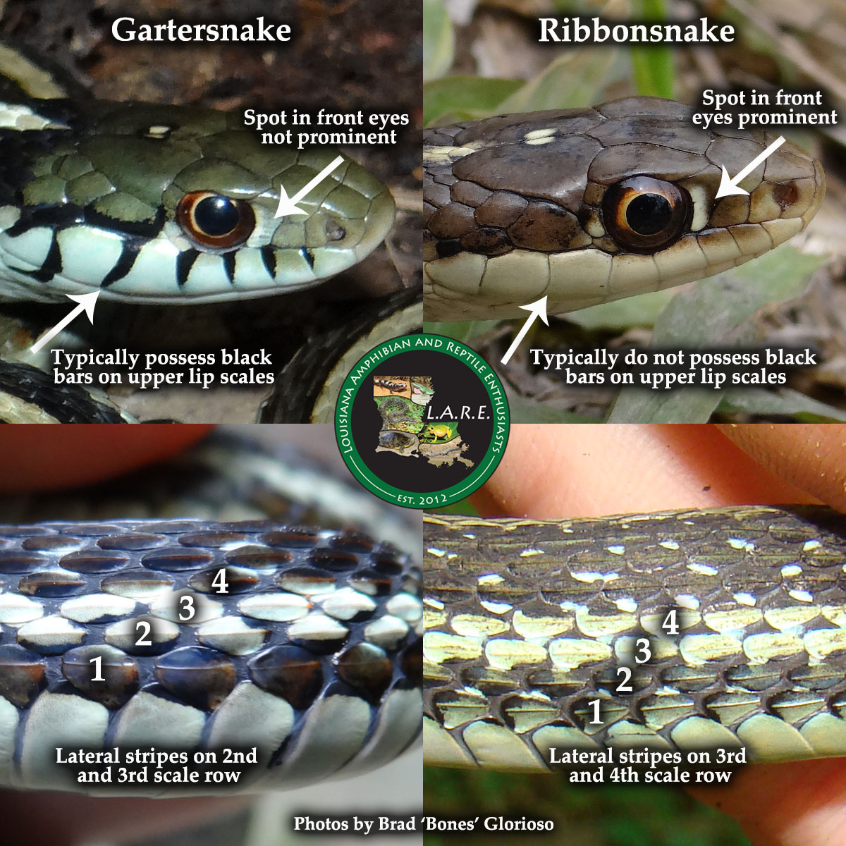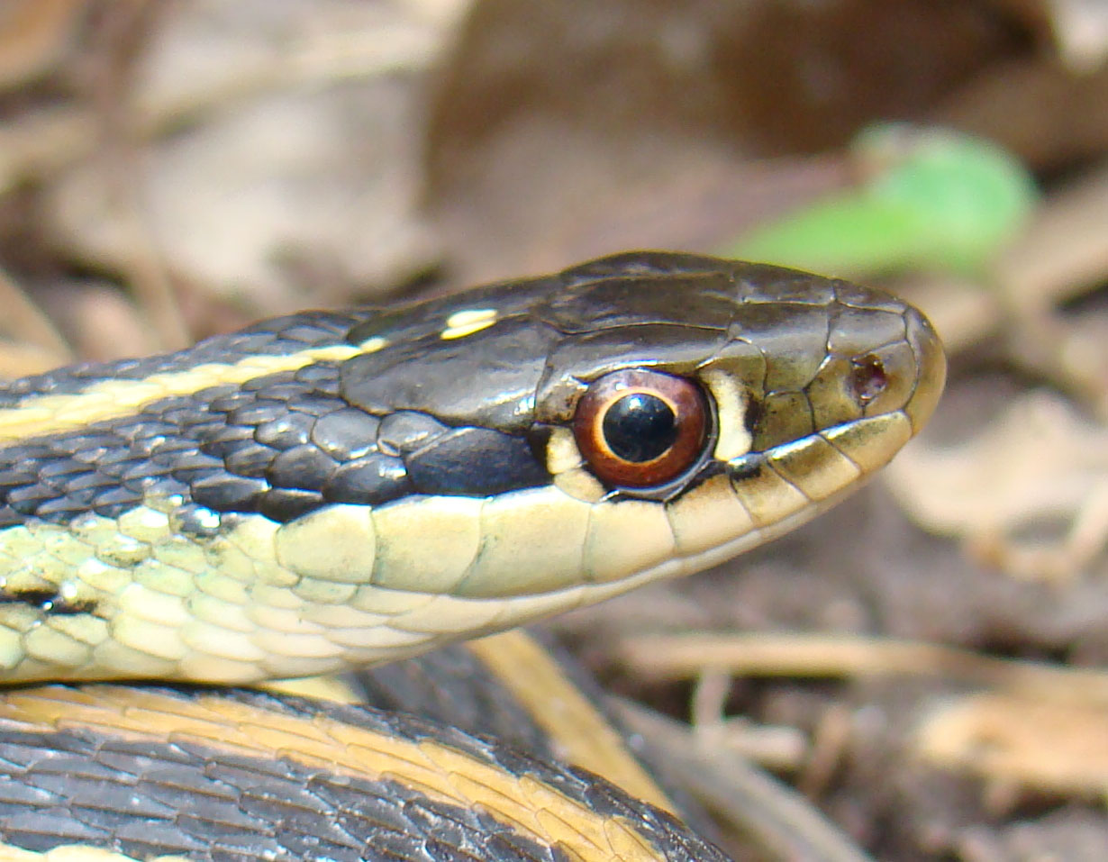 Similar Species: Common Gartersnakes have lateral stripes on the second and third scale row whereas the two species of Ribbonsnakes in Louisiana have lateral stripes on the third and fourth scale row. In addition Common Gartersnakes have a relatively shorter tail than Ribbonsnakes and typically posses black bars on the posterior labial (lip) scales whereas Ribbonsnakes have raltively longer tails and typically have unmarked labial scales. In addition the preocular creamy spot is typically more prominent in the Ribbonsnakes than the Common Gartersnake. In the small area of the eastern Florida Parishes where the Eastern Ribbonsnake overlaps the range of the Western Ribbonsnake, the two species can be told apart by examining the top of the head and the area where the dorsal scales meet the ventral scales. Typically Eastern Ribbonsnakes either lack parietal spots completely or they are much reduced compared to the bold marks typical of Western Ribbonsnakes. Also, Eastern Ribbonsnakes typically have a brownish tinge to the edges of the ventral scales where they meet the dorsal scares whereas the ventral scales are typically immaculate in Western Ribbonsnakes.