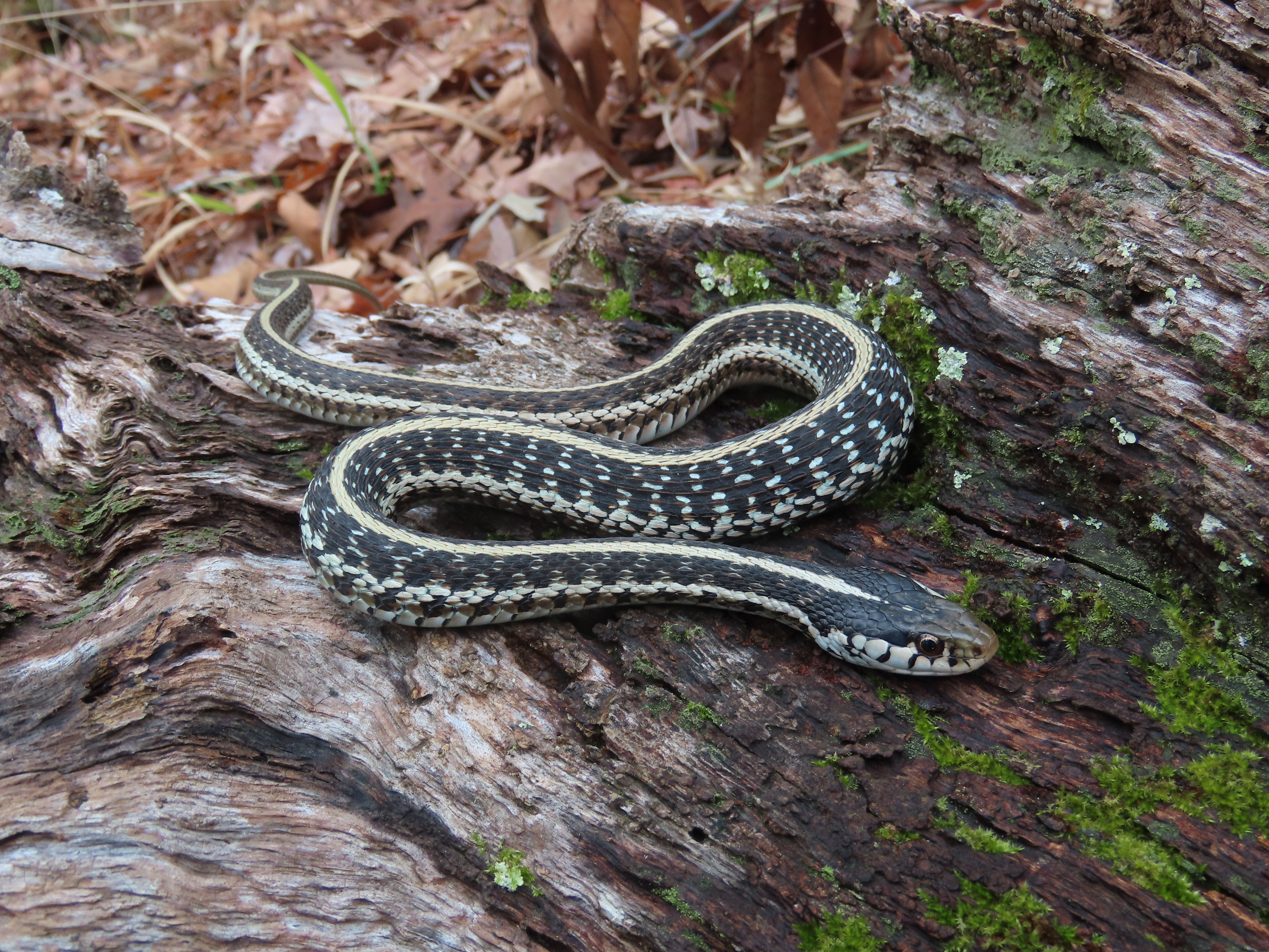 Similar Species: Common Gartersnakes have lateral stripes on the second and third scale row whereas the two species of Ribbonsnakes in Louisiana have lateral stripes on the third and fourth scale row. In addition Common Gartersnakes have a relatively shorter tail than Ribbonsnakes and typically posses black bars on the posterior labial (lip) scales whereas Ribbonsnakes have raltively longer tails and typically have unmarked labial scales. In addition the preocular creamy spot is typically more prominent in the Ribbonsnakes than the Common Gartersnake. In the small area of the eastern Florida Parishes where the Eastern Ribbonsnake overlaps the range of the Western Ribbonsnake, the two species can be told apart by examining the top of the head and the area where the dorsal scales meet the ventral scales. Typically Eastern Ribbonsnakes either lack parietal spots completely or they are much reduced compared to the bold marks typical of Western Ribbonsnakes. Also, Eastern Ribbonsnakes typically have a brownish tinge to the edges of the ventral scales where they meet the dorsal scares whereas the ventral scales are typically immaculate in Western Ribbonsnakes.