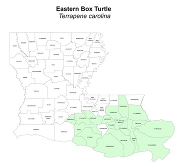Author's Remarks: I have observed box turtles occasionally in the Atchafalaya Basin, St. Bernard Parish, Tangipahoa Parish, St. Tammany Parish, and a couple in Ouachita Parish. I have also seen one individual on the road in Kisatchie National Forest (Natchitoches Parish), Sam Houston Jones State Park (Calcasieu Parish), Bienville Parish in northern Louisiana, in Rapides Parish, and at Mary Ann Brown Preserve in West Feliciana Parish.