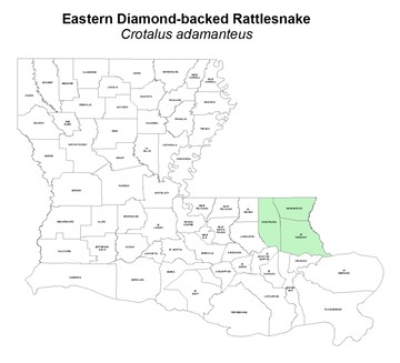 Louisiana Conservation Status: Eastern Diamond-backed Rattlesnakes have a ranking of S1 (critically imperiled because of extreme rarity – 5 or fewer known extant populations) in Louisiana. In Louisiana, Eastern Diamond-backed Rattlesnakes have a State Protection Status of ‘prohibited’, meaning possession or harvest of this species is illegal.