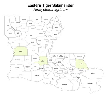 Louisiana Conservation Status: Eastern Tiger Salamanders have a ranking of S1 (critically imperiled because of extreme rarity – 5 or fewer known extant populations) in Louisiana. In Louisiana, Tiger Salamanders have a State Protection Status of ‘prohibited’, meaning possession or harvest of this species is illegal.