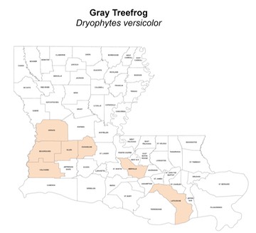 Louisiana Conservation Status: Gray Treefrogs have a ranking of S3 (rare and local throughout the state – 21-100 known extant populations) in Louisiana.
