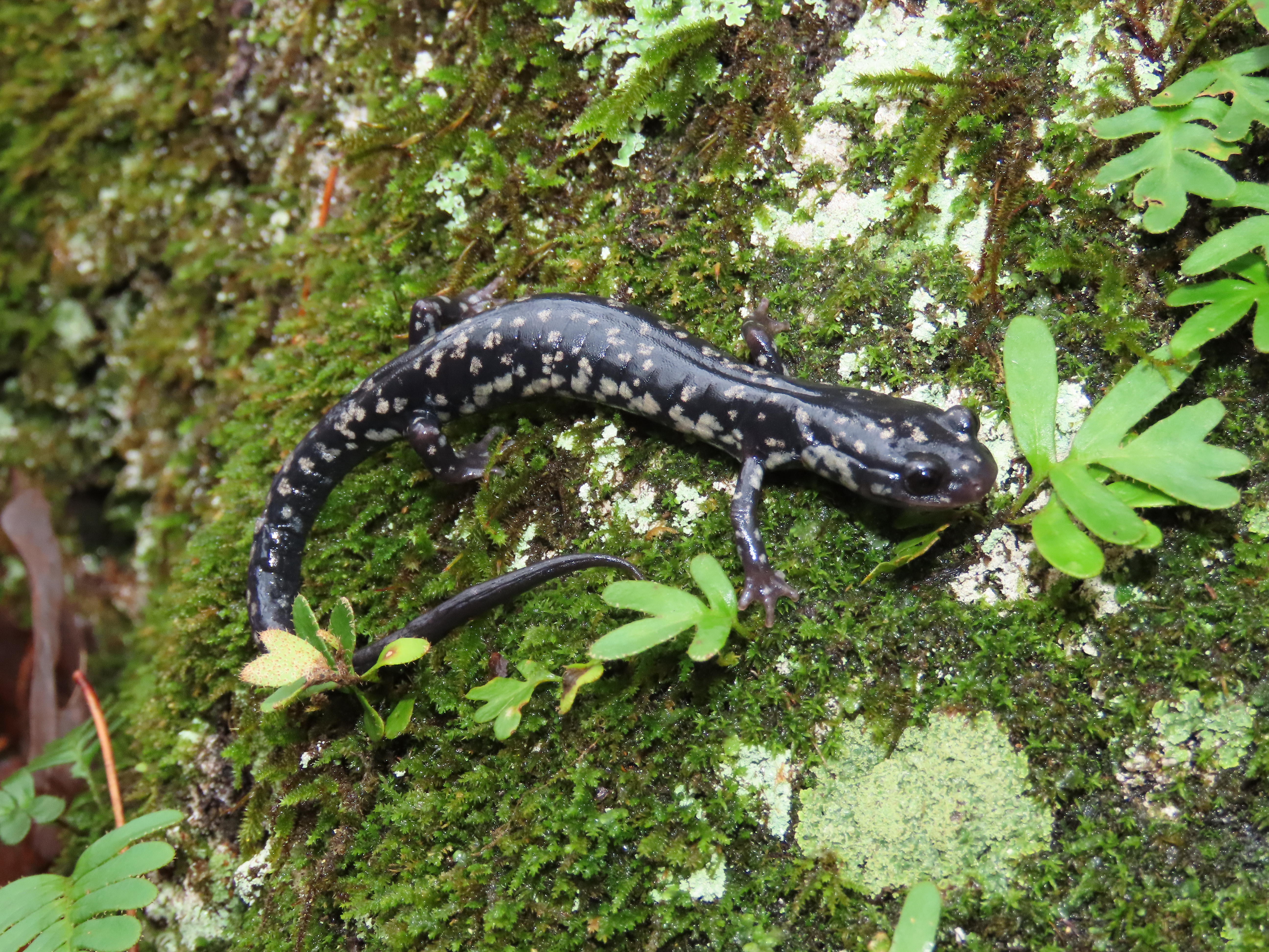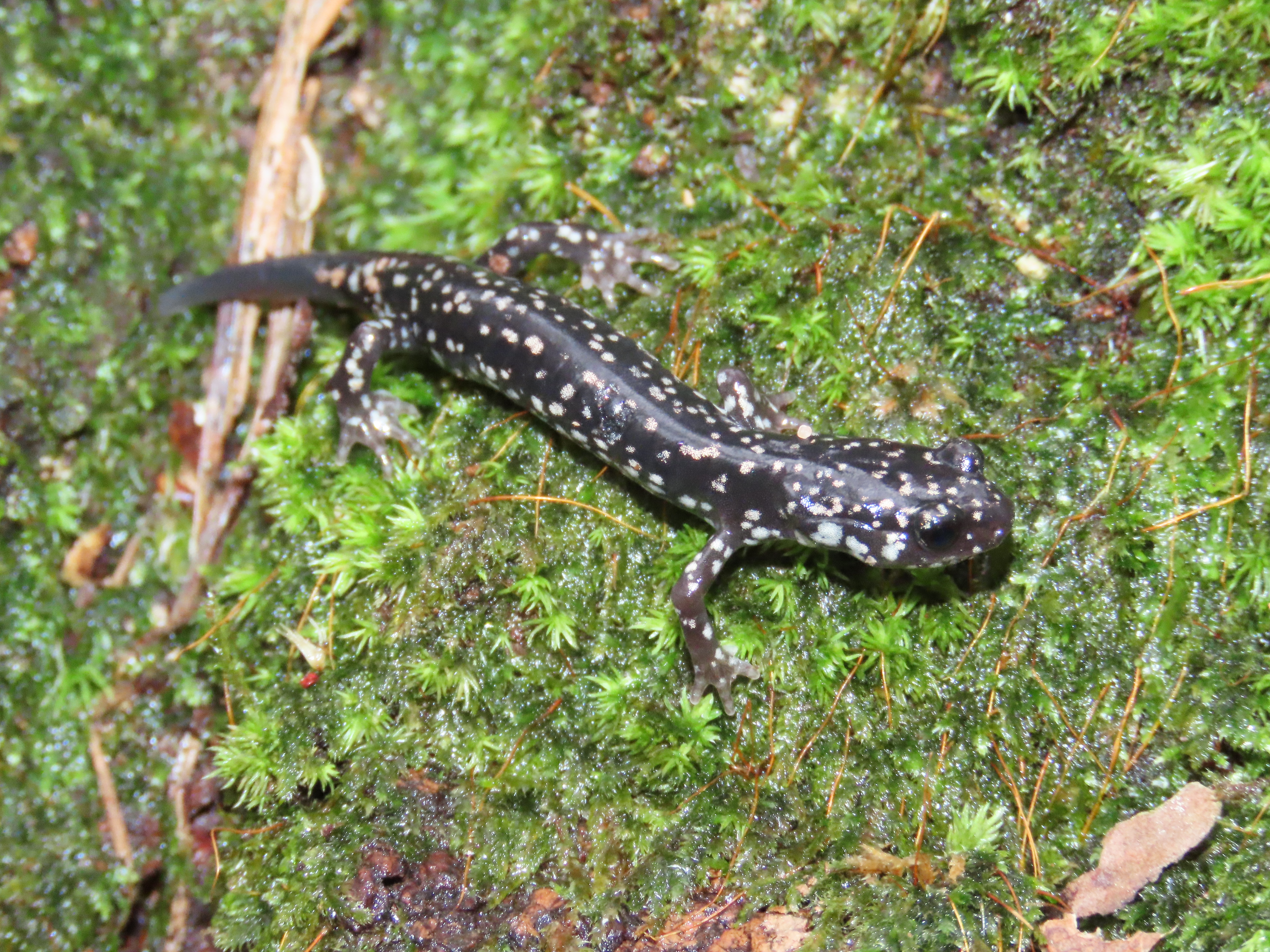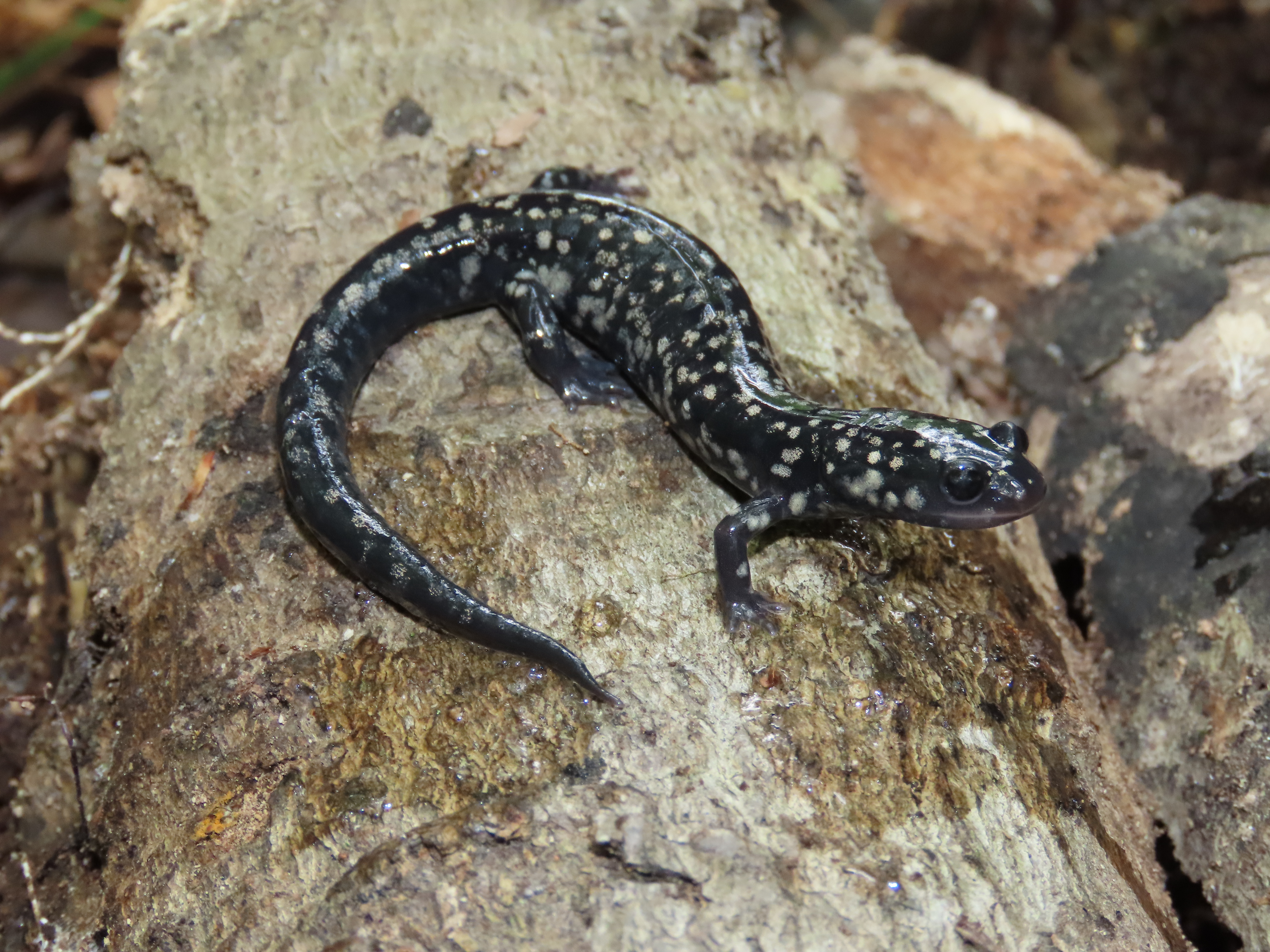 Adult Description: Medium-sized salamander (maximum 5.8”) with black coloration on top with scattered white to brassy spots, often more concentrated on sides compared to top, with a round tail in cross section. 15 costal grooves. Adult males possess oval-shaped mental glands. Pinkish-gray throat with a black or dark gray belly, usually without much spotting.