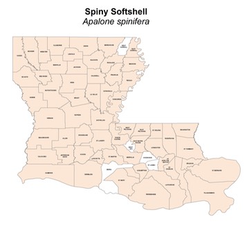Subspecies: The Pallid Spiny Softshell, Apalone spinifera pallida, occurs within southwest Louisiana and also in northern Louisiana where it intergrades with the Northern Spiny Softshell, Apalone spinifera spinifera. The Gulf Coast Spiny Softshell, Apalone spinifera aspera, occurs in southeastern Louisiana. Intergrades of all three subspecies can be found in the lower Mississippi River drainage of the state.
