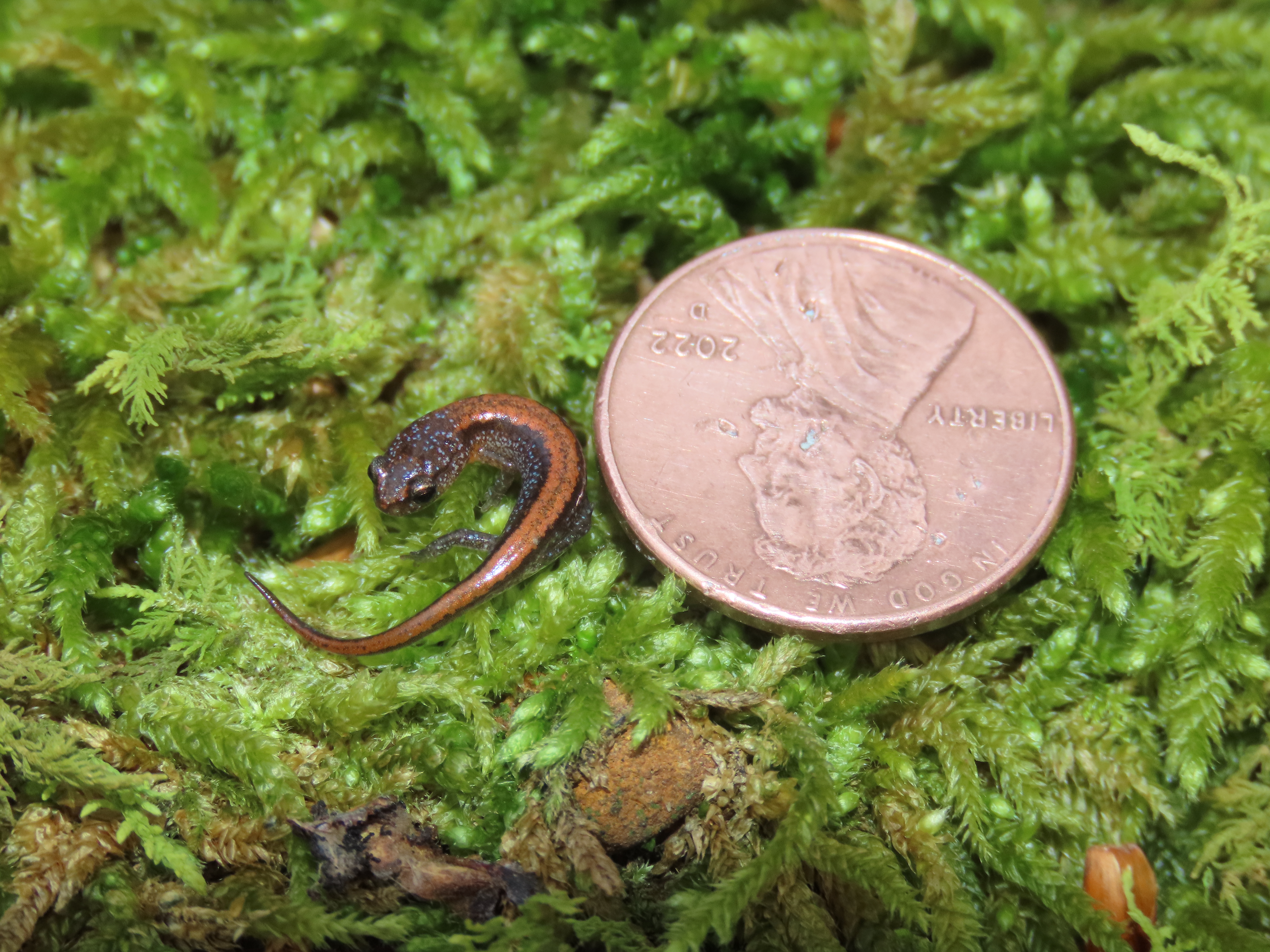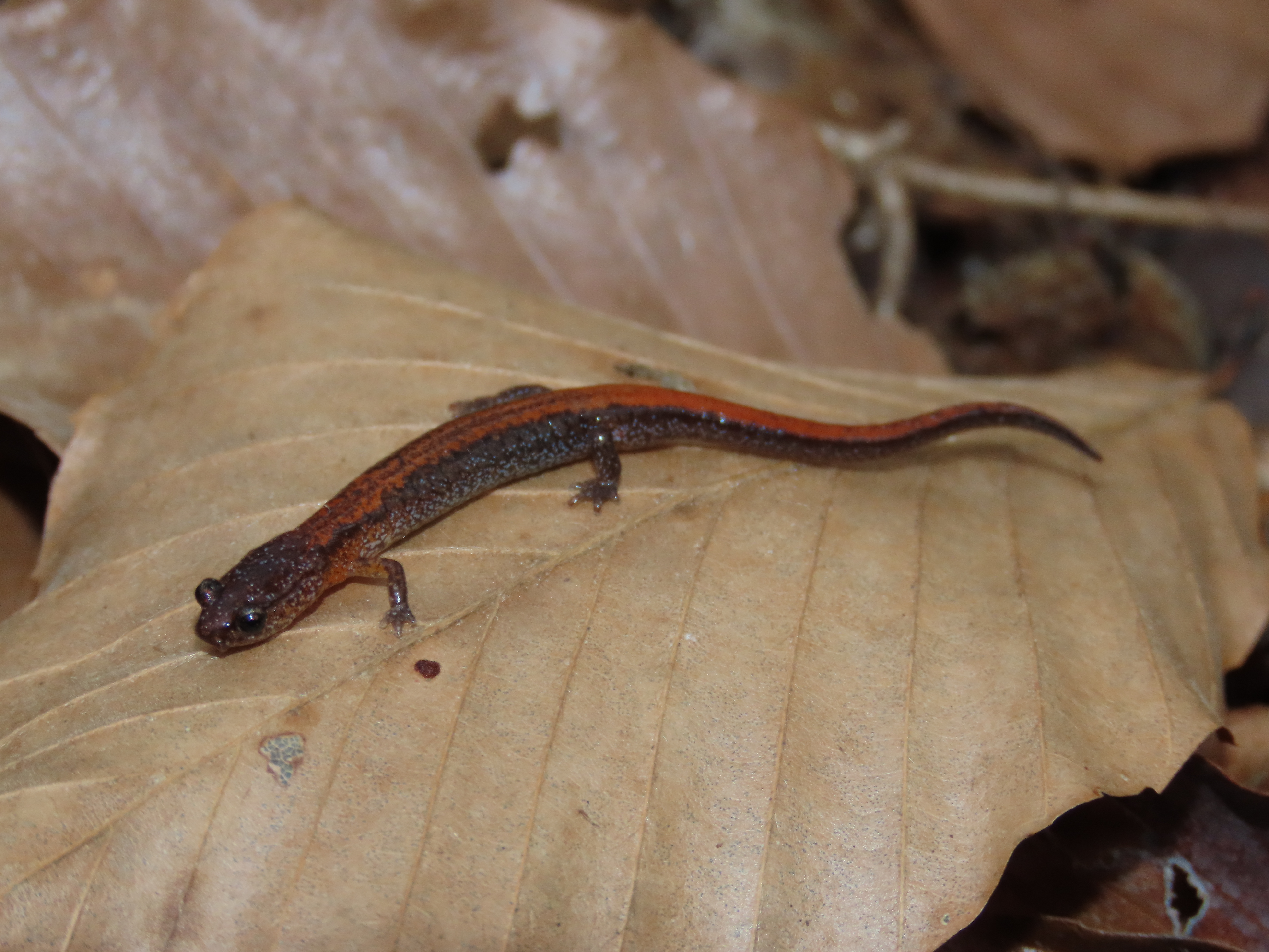 Adult Description: Small, slender salamander (maximum 3.2”) with short legs, a round tail in cross section, and an orange to reddish stripe on top from neck to tail tip, usually more vibrant towards tail, often with dark margins. Orange coloration may also be found on neck and base of forelimbs. Sides are dark gray with scattered pale flecks. 18 costal grooves. Adult males possess mental glands. Belly is somewhat translucent and mottled with gray and pale markings.